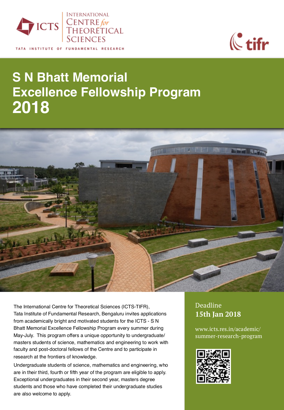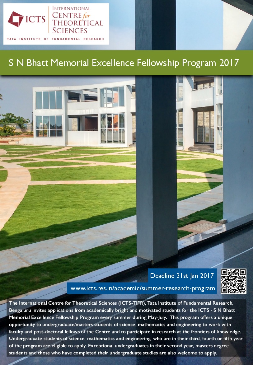 International Centre for Theoretical Sciences (ICTS-TIFR), Tata Institute of Fundamental Research, Bengaluru invites applications from academically bright and motivated students for the ICTS - S. N. Bhatt Memorial Excellence Fellowship Program which typically happens every summer around the middle of May till the middle of July.