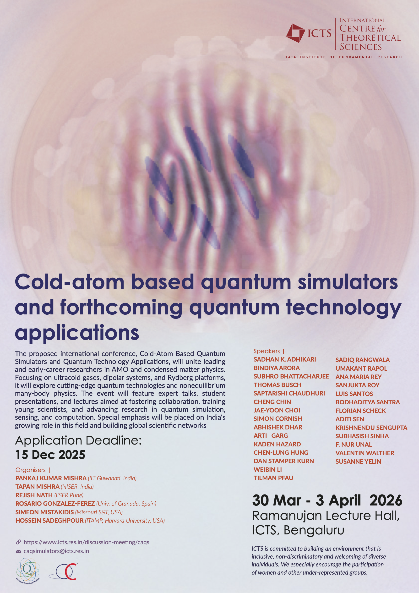 Eligibility Criteria: The program is primarily intended for graduate students and postdoctoral researchers working in cold atom physics, quantum simulation, AMO physics, and related areas. A limited number of highly motivated senior undergraduate students with strong academic backgrounds may also be considered. Participants are expected to have a basic understanding of quantum mechanics and statistical physics to fully benefit from the lectures and discussions.