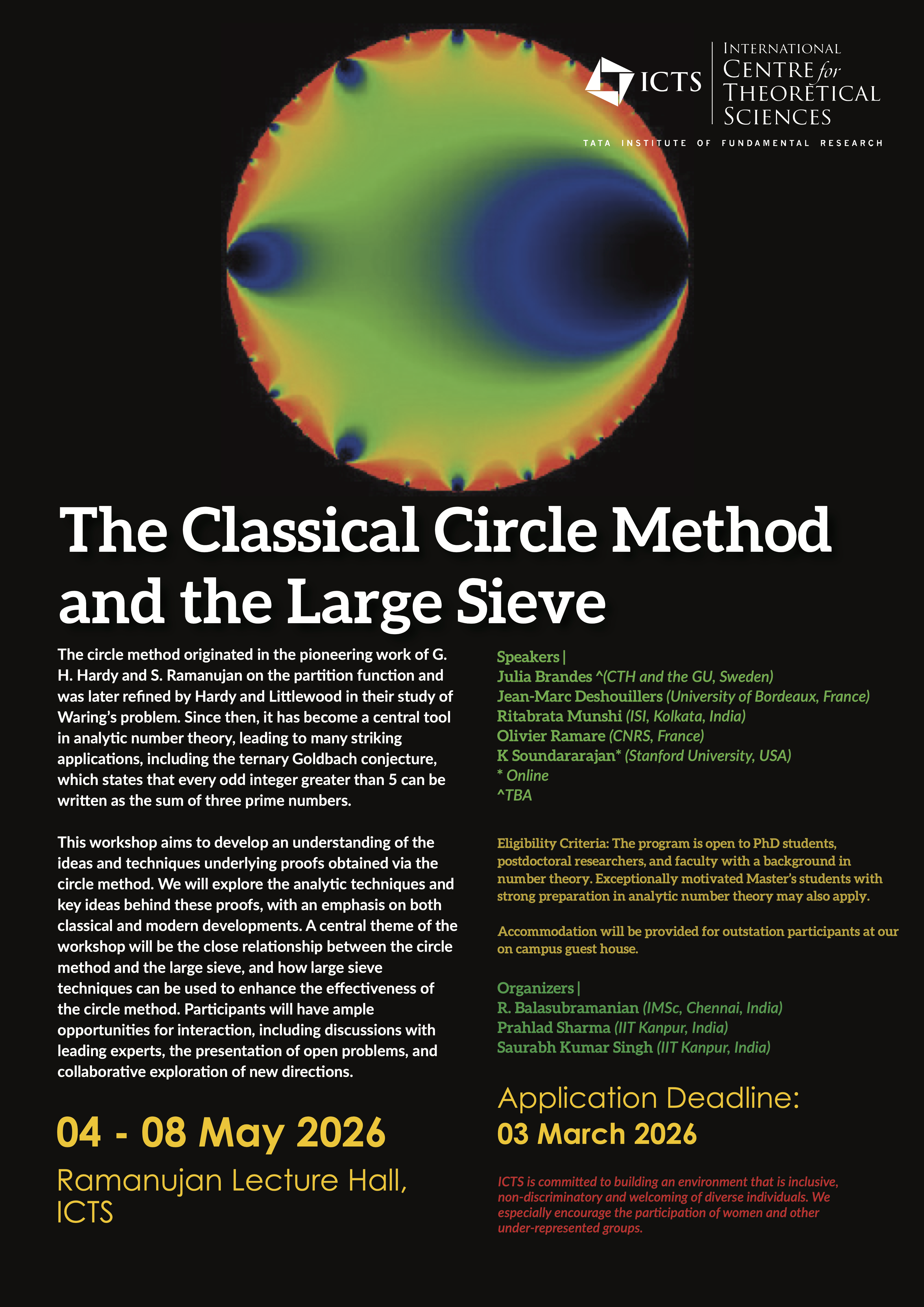 Eligibility criteria: The program is open to PhD students, postdoctoral researchers, and faculty with a background in number theory. Exceptionally motivated Master’s students with strong preparation in analytic number theory may also apply.