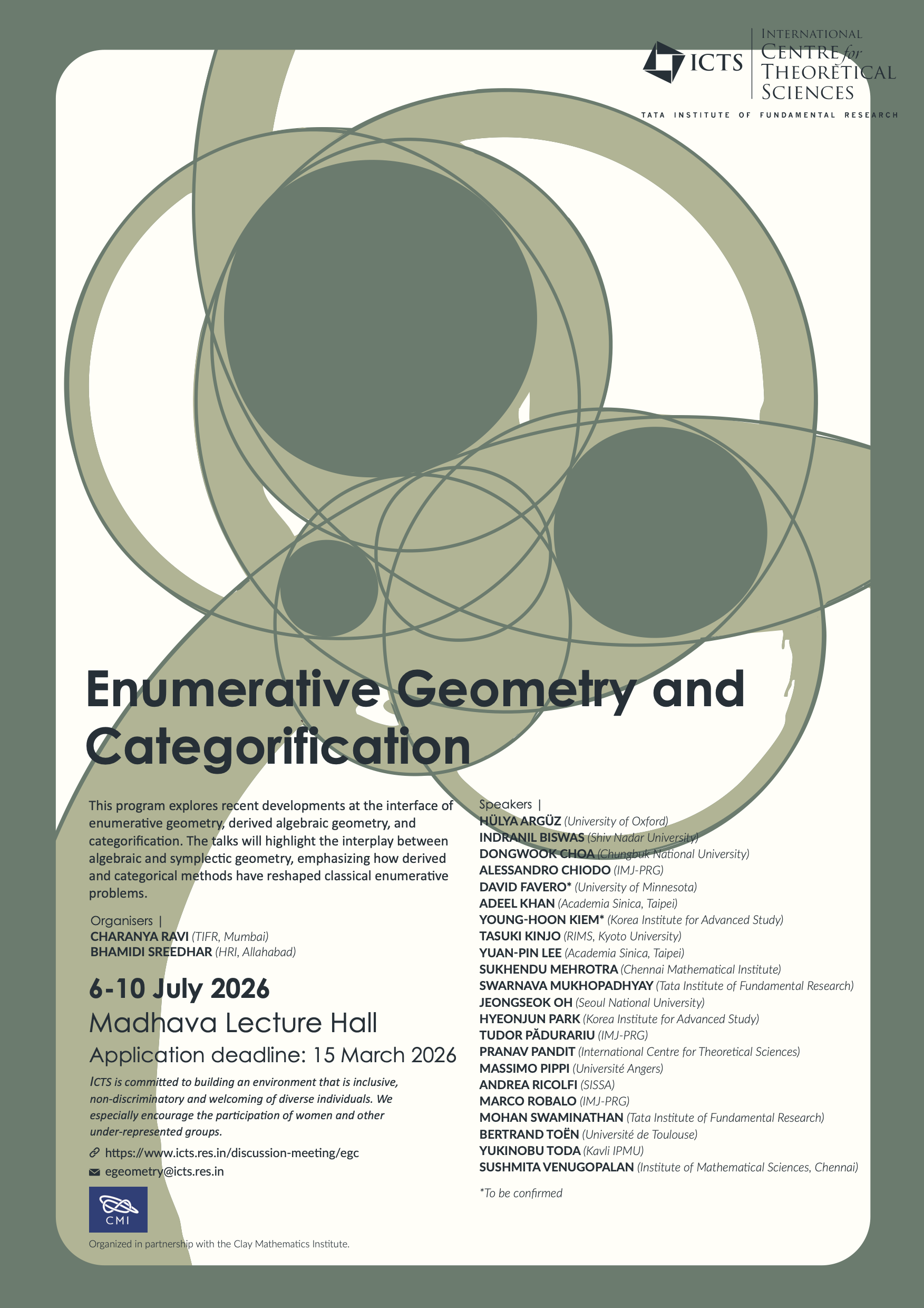 Eligibility Criteria: The program is primarily intended for researchers working in algebraic geometry, symplectic geometry, enumerative geometry, and related areas. Graduate students and postdoctoral researchers working in these topics are encouraged to apply. Familiarity with graduate-level algebraic geometry, moduli theory, and algebraic stacks will be beneficial for participants.