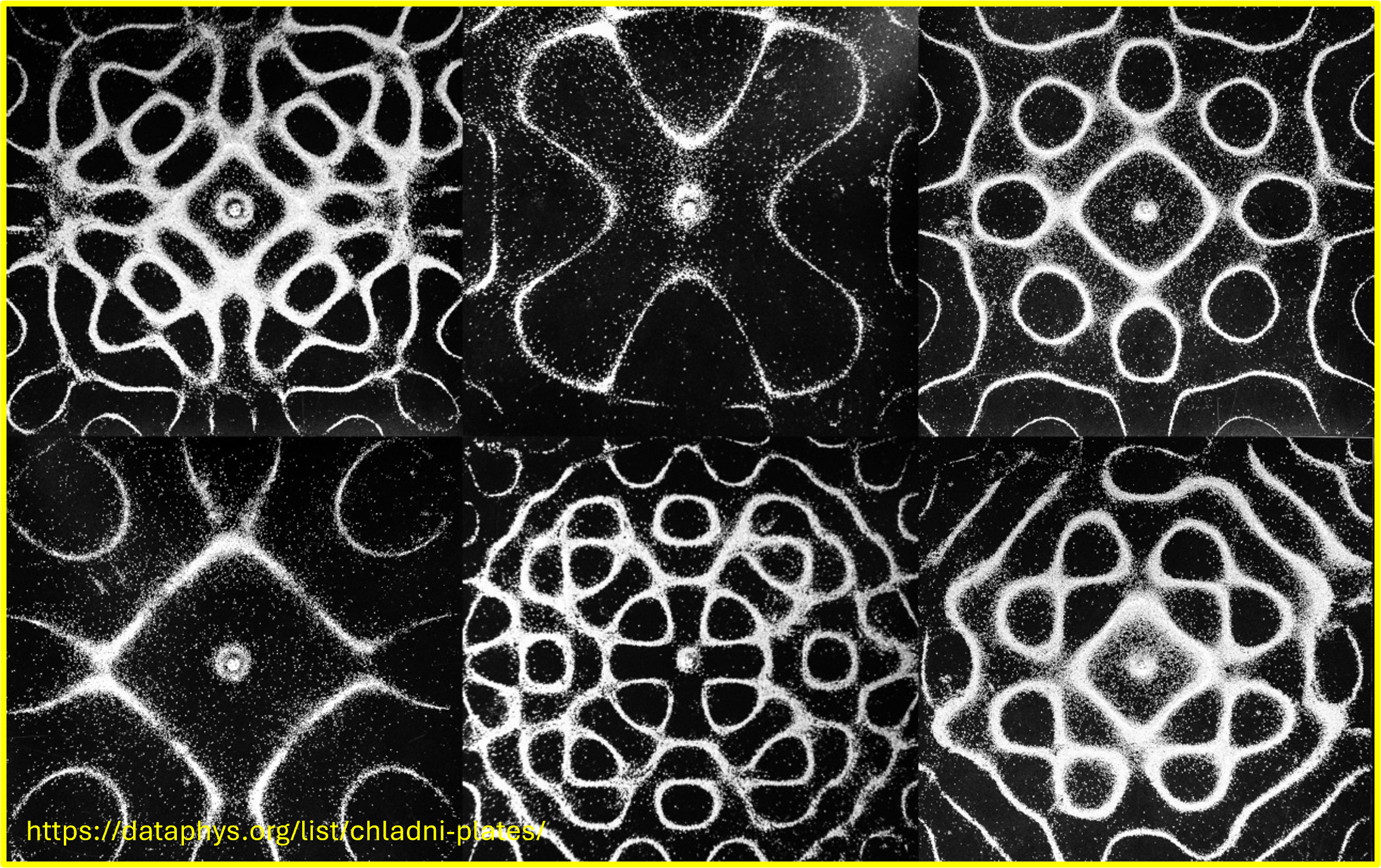 The patterns form because of the way sound waves interfere with each other on the surface of the plate. When the frequency is just right, the waves constructively and destructively interfere to create standing waves, which lead to the formation of nodes and antinodes. These standing waves are essentially the plate’s way of "resonating" at a particular frequency, and each pattern corresponds to a different mode of vibration. The patterns can be found in the image and videos below: