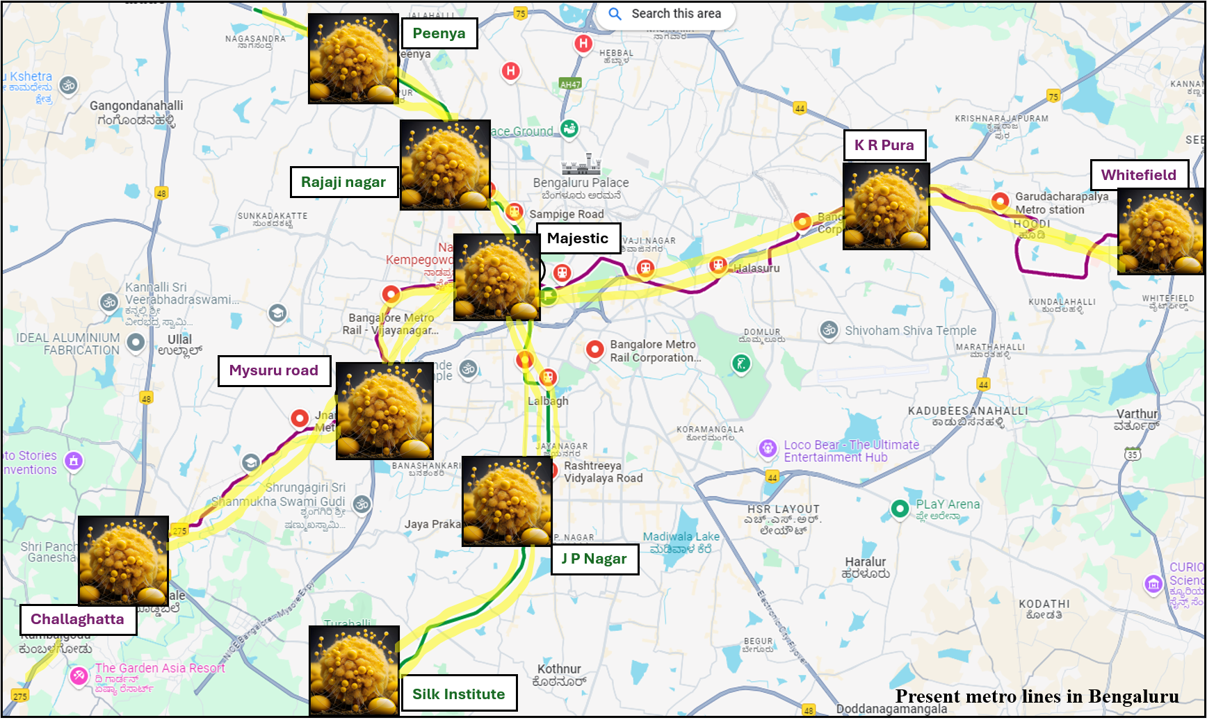 Slime molds, despite lacking a brain, have an impressive ability to find the most efficient paths between food sources. In our experiment, we simulate major transit hubs in Bengaluru by placing food (oats) on a map. As the slime mold grows, it extends protoplasmic tubes to connect these food sources, mimicking the way metro lines might link different parts of the city. Over time, the slime mold creates a network that, much like a human-designed metro system, optimizes fault tolerance.