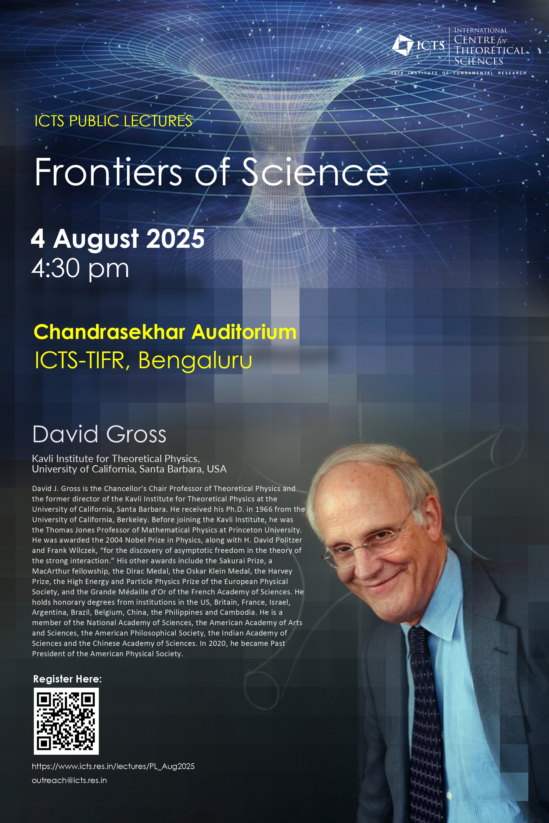 David J. Gross is the Chancellor’s Chair professor of theoretical physics and the former director of the Kavli Institute for Theoretical Physics at the University of California, Santa Barbara. He received his Ph.D. in 1966 from the University of California, Berkeley. Before joining the Kavli Institute, he was the Thomas Jones professor of mathematical physics at Princeton University. Gross was awarded the 2004 Nobel Prize in Physics, along with H. David Politzer and Frank Wilczek, “for the discovery of asymptotic freedom in the theory of the strong interaction.” His other awards include the Sakurai Prize, a MacArthur fellowship, the Dirac Medal, the Oskar Klein Medal, the Harvey Prize, the High Energy and Particle Physics Prize of the European Physical Society, and the Grande Médaille d’Or of the French Academy of Sciences. He holds honorary degrees from institutions in the US, Britain, France, Israel, Argentina, Brazil, Belgium, China, the Philippines and Cambodia. He is a member of the National Academy of Sciences, the American Academy of Arts and Sciences, the American Philosophical Society, the Indian Academy of Sciences and the Chinese Academy of Sciences. In 2020, he became Past President of the American Physical Society.