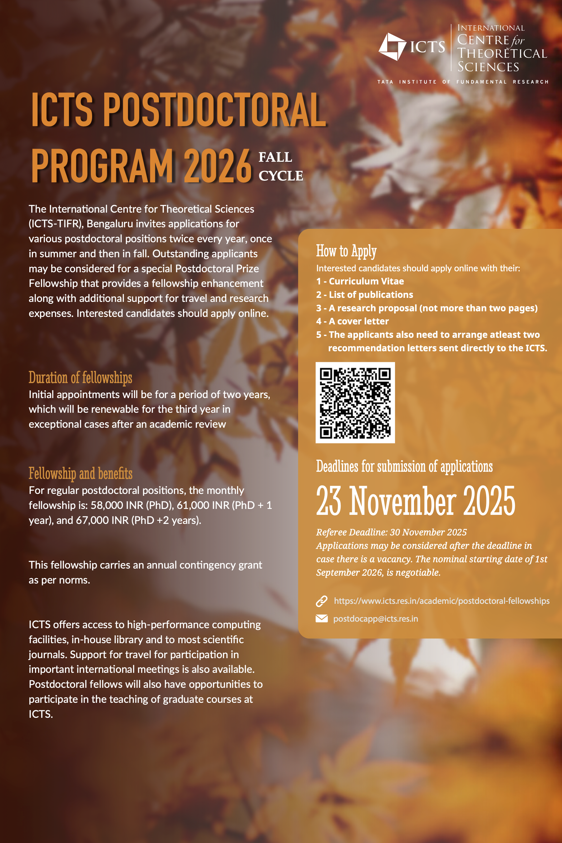 ICTS invites applications for various postdoctoral positions twice every year, once in summer and then in fall. Outstanding applicants may be considered for a special Postdoctoral Prize Fellowship that provides a fellowship enhancement along with additional support for travel and research expenses. Interested candidates should apply online.