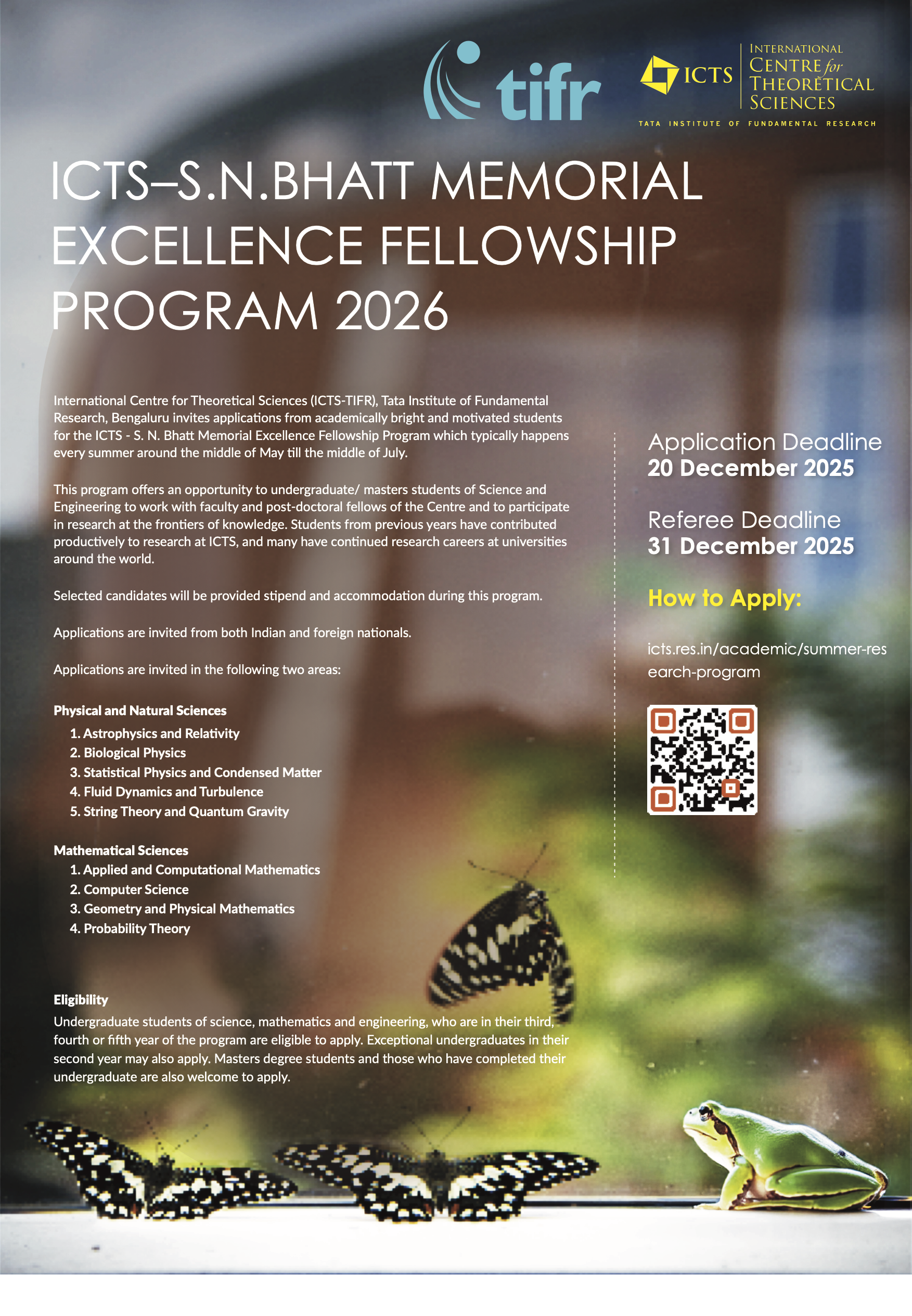 Applicants who are required to send the applications by post must superscribe the program name on the envelope. Applications by post must reach Academic Office, ICTS-TIFR campus, Survey No. 151, Shivakote Village, Hesaraghatta Hobli, North Bangalore 560089 by 20 December 2025.
