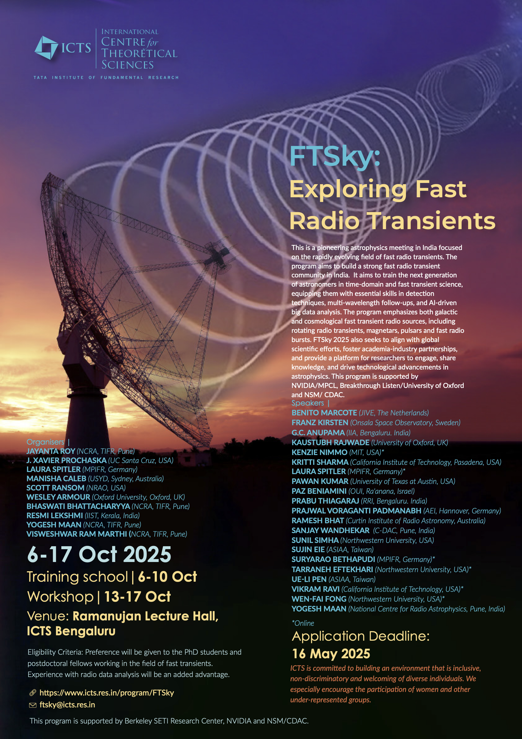 Eligibility: For the training school week the preference will be given to the PhD students and postdoctoral fellows working in the field of fast transients. Experience with radio data analysis will be an added advantage. The workshop week will primarily focus on providing a comprehensive update on the entire field through invited and contributory talks, along with discussion sessions.