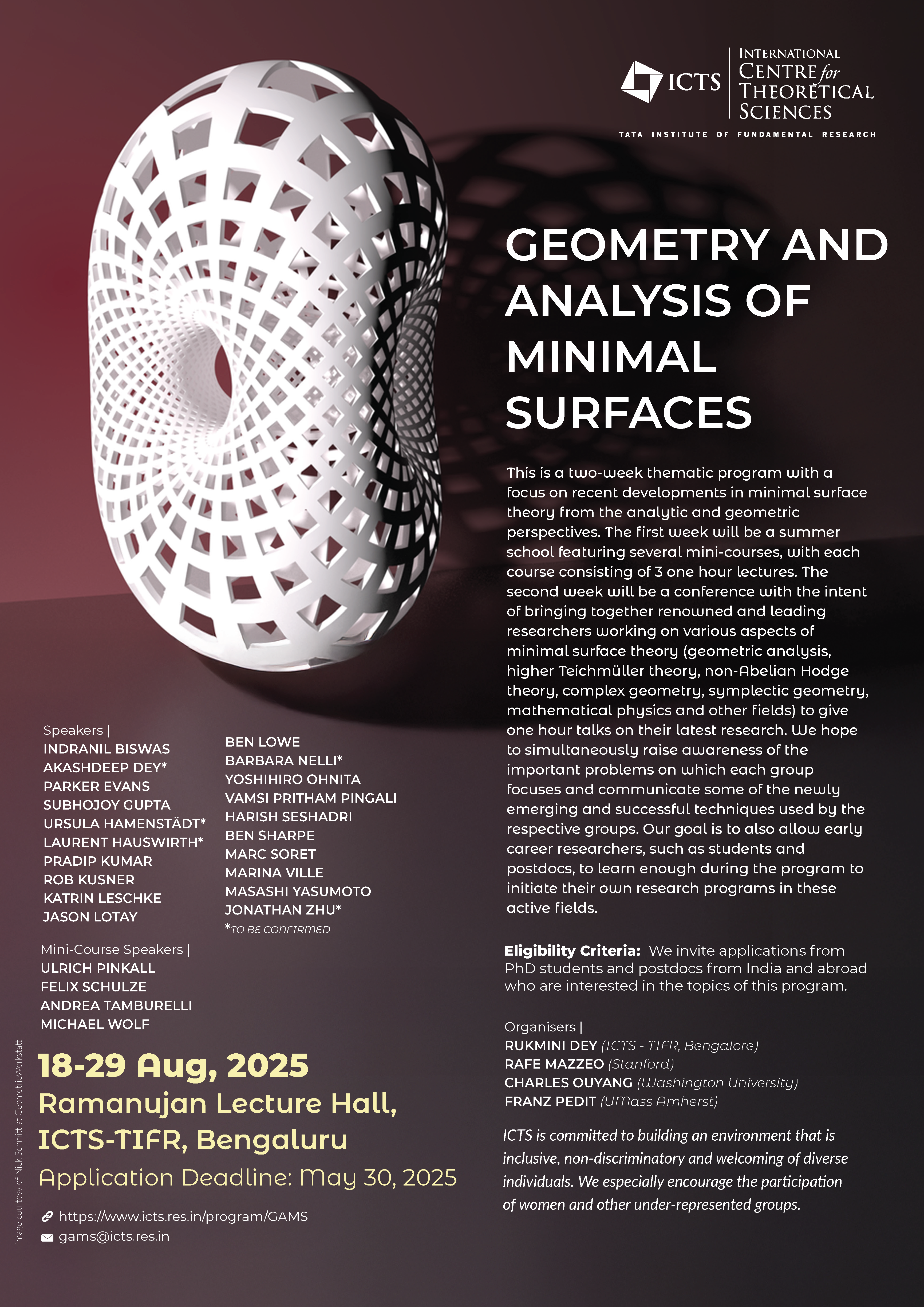 This is a two-week thematic program with a focus on recent developments in minimal surface theory. The first week will be a summer school featuring several mini-courses, with each course consisting of 3 one hour lectures. The second week will be a conference with the intent of bringing together renowned and leading researchers working on various aspects of minimal surface theory (geometric analysis, higher Teichmüller theory, non-Abelian Hodge theory, complex geometry, symplectic geometry, mathematical physics and other fields) to give one hour talks on their latest research. We hope to simultaneously raise awareness of the important problems on which each group focuses and communicate some of the newly emerging and successful techniques used by the respective groups. Our goal is to also allow early career researchers, such as students and postdocs, to learn enough during the program to initiate their own research programs in these active fields.