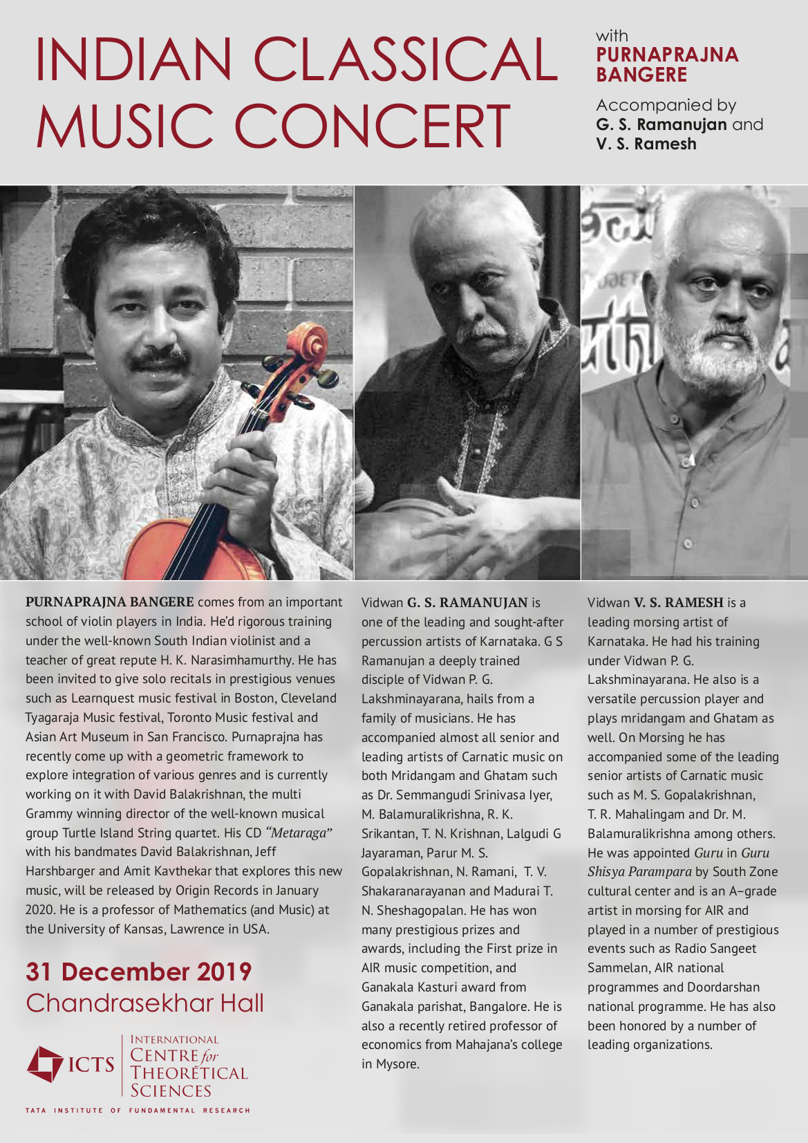 Purnaprajna Bangere comes from an important school of violin players in India. He had rigorous training under the well-known south Indian violinist and a teacher of great repute H.K. Narasimhamurthy. He has been invited to give solo recitals in various prestigious venues such as Learnquest music festival in Boston, Cleveland Tyagaraja Music festival, Toronto Music festival and Asian Art Museum in San Francisco. Purnaprajna has recently come up with a geometric framework to explore integration of various genres and is currently working on it with David Balakrishnan, the multi Grammy winning director of the well-known musical group Turtle Island String quartet. His CD “Metaraga” with his bandmates David Balakrishnan, Jeff Harshbarger and Amit Kavthekar that explores this new music, will be released under the well-known label Origin Records in January 2020. He is a professor of Mathematics (and Music) at the University of Kansas, Lawrence in USA.