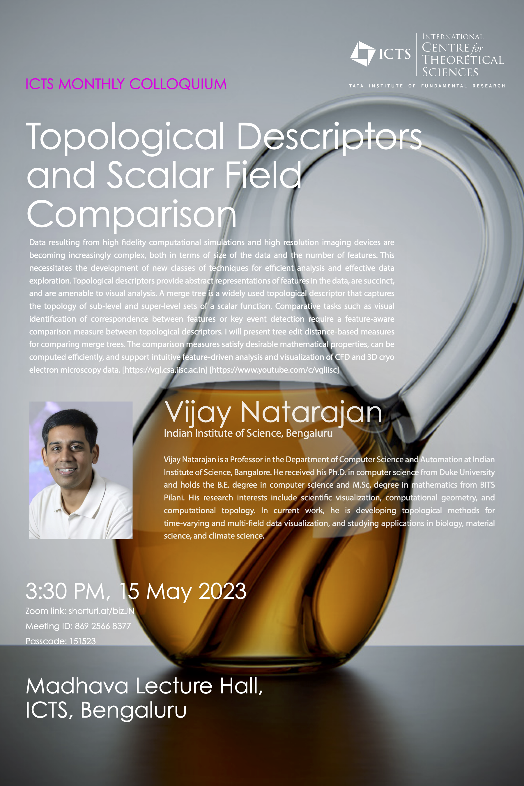 Data resulting from high fidelity computational simulations and high resolution imaging devices is becoming increasingly complex, both in terms of size of the data and the number of features. This necessitates the development of new classes of techniques for efficient analysis and effective data exploration. Topological descriptors provide abstract representations of features in the data, are succinct, and are amenable to visual analysis. A merge tree is a widely used topological descriptor that captures the topology of sub-level and super-level sets of a scalar function. Comparative tasks such as visual identification of correspondence between features or key event detection require a feature-aware comparison measure between topological descriptors. I will present tree edit distance-based measures for comparing merge trees. The comparison measures satisfy desirable mathematical properties, can be computed efficiently, and support intuitive feature-driven analysis and visualization of CFD and 3D cryo electron microscopy data. [vgl.csa.iisc.ac.in] [https://www.youtube.com/c/vgliisc]