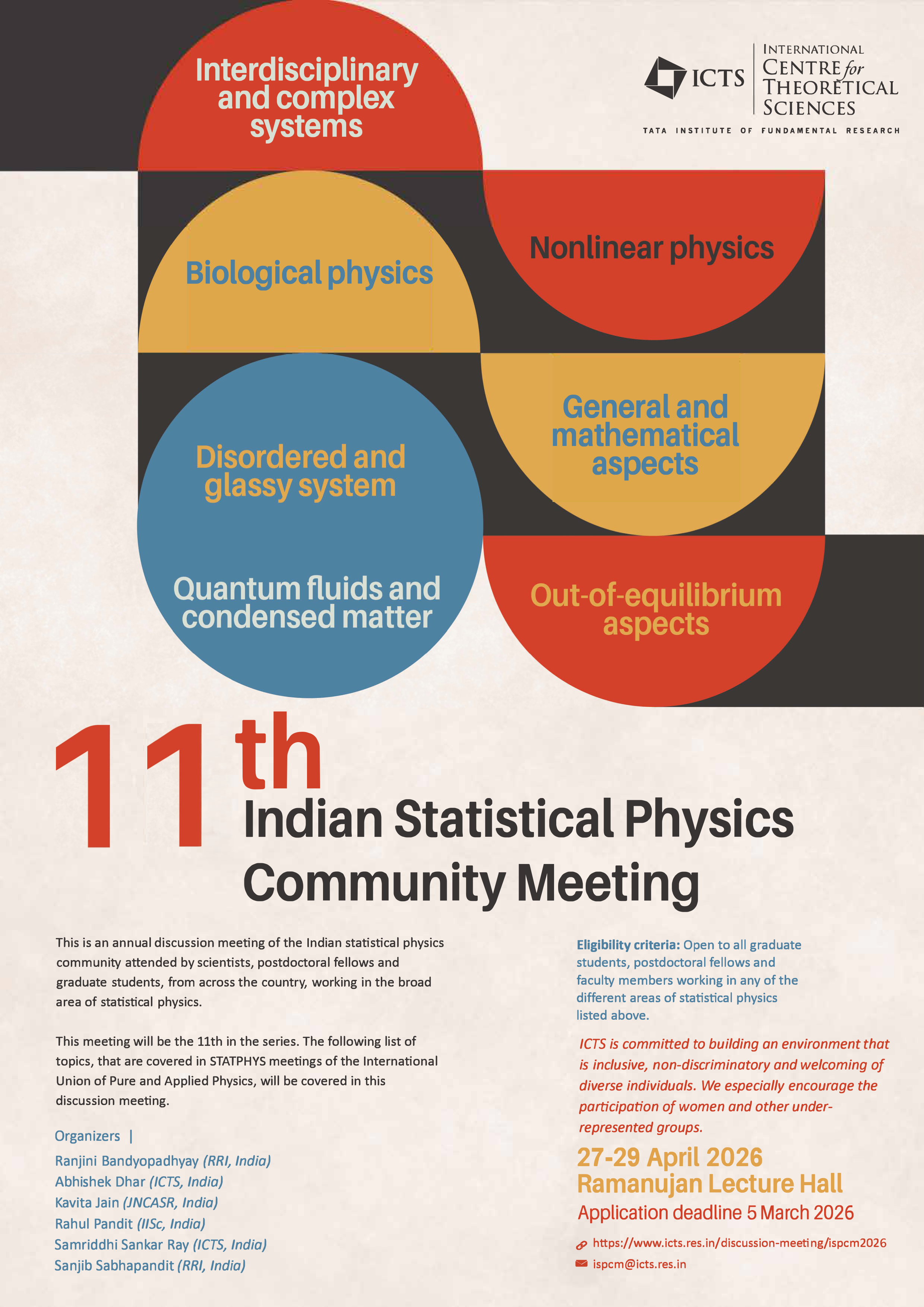 Eligibility criteria: Open to all graduate students, postdoctoral fellows and faculty members working in any of the different areas of statistical physics listed above.