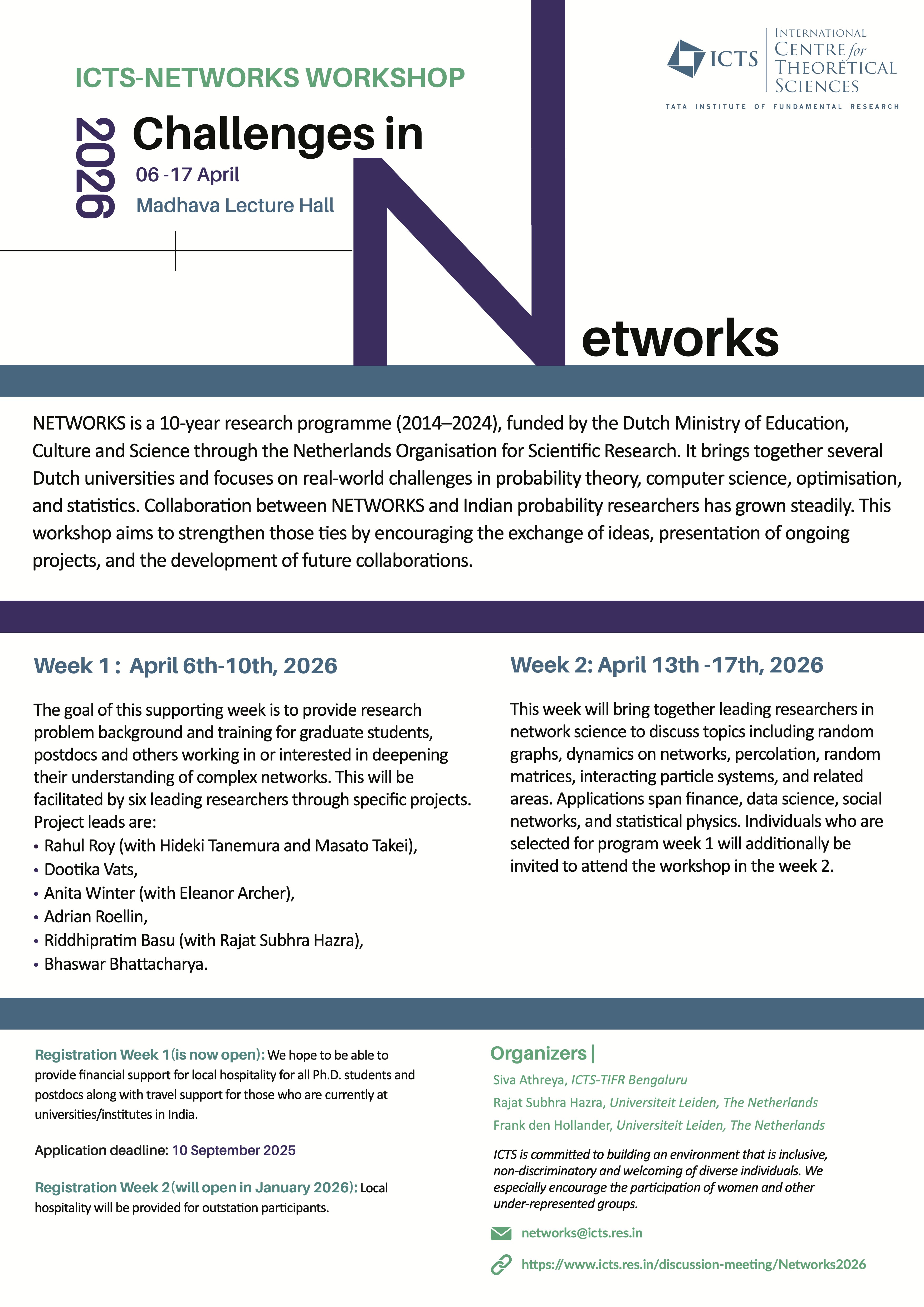 The aim of the program during week 2 is to bring in leading researchers in network science for an active discussion and exchange of ideas. NETWORKS is a long-term programme (started in 2014) funded by the Dutch Ministry of Education, Culture and Science through the Netherlands Organisation for Scientific Research. Several Dutch universities belong to this group. Many Indian scientists are in active collaboration with the NETWORKS group, and the workshop in week 2 will form a platform for exchange of ideas and projects and further collaborations. The NETWORKS project focusses on real-world applications of theoretical developments in probability theory, computer science, optimization, and statistics. Earlier joint meetings included a symposium at the Indian Statistical Institute in Kolkata (2018), one-day workshops in the Netherlands during 2017–2019, and a meeting at ICTS in 2024.