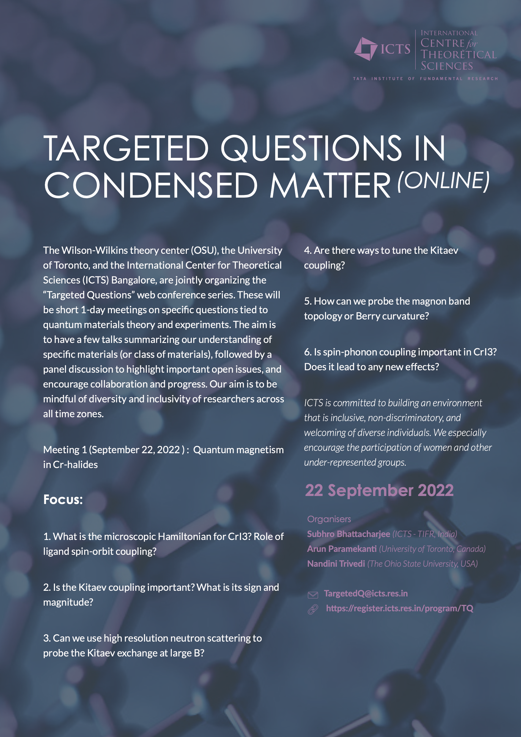 The Wilson-Wilkins theory center (OSU), the University of Toronto, and the International Center for Theoretical Sciences (ICTS) Bangalore, are jointly organizing the “Targeted Questions” web meeting series. These will be short 1-day meetings on specific questions tied to quantum materials theory and experiments. The aim is to have a few talks summarizing our understanding of specific materials (or class of materials), followed by a panel discussion to highlight important open issues, and encourage collaboration and progress. Our aim is to be mindful of diversity and inclusivity of researchers across all time zones.