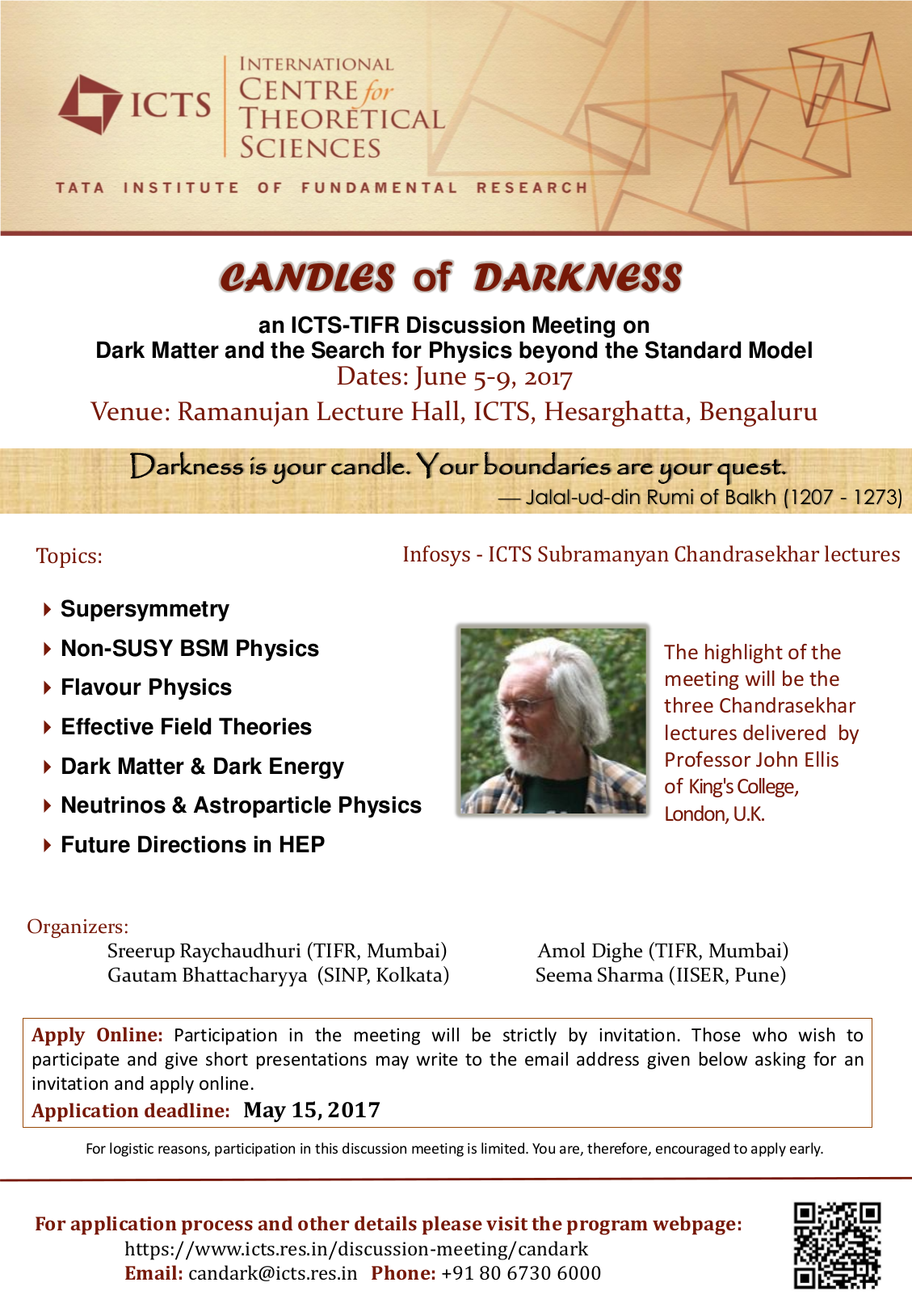 High energy Physics today has, in a sense, literally entered into a Dark Age. We know for about two decades that the Universe is mainly dark, with more than a quarter being Dark Matter, and roughly two-thirds being Dark Energy. It is only the remaining five percent or so of the Universe which we have been able to investigate thoroughly, and even here all that we have is a very successful phenomenological model – which we proudly call the Standard Model – which itself has plenty of loopholes. At the moment, both on the theoretical and experimental front, therefore, high energy physicists are essentially groping in the dark for answers to these puzzles. This is a good moment, therefore, to introspect, and it is in this context that the thought-provoking words quoted above become especially relevant, for it is by probing the present darkness that we will have to find the way forward. This discussion meeting is therefore called ‘Candles of Darkness’, for it is our hope to further the cause of introspection and out-of-the-box thinking which is the need of the day. A highlight of the meeting will be the three Infosys-ICTS Subrahmanyan Chandrasekhar lectures, which will be delivered by Professor John Ellis of King's College, London, UK, doyen of the high energy phenomenologist community. Other eminent speakers will review more specific topics and share their insights and perspective.