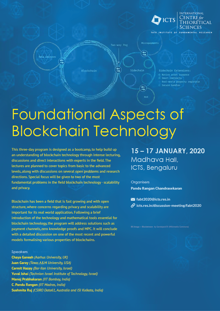 This three-day program is designed as a bootcamp, to help build up an understanding of blockchain technology through intense lecturing, discussions and direct interactions with experts in the field. The lectures are planned to cover topics from basic to the advanced levels, along with discussions on several open problems and research directions. Special focus will be given to two of the most fundamental problems in the field blockchain technology - scalability and privacy.