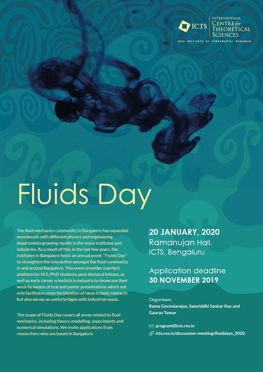 The scope of Fluids Day covers all areas related to fluid mechanics, including theory, modelling, experiments and numerical simulations. We invite applications from researchers who are based in Bangalore.