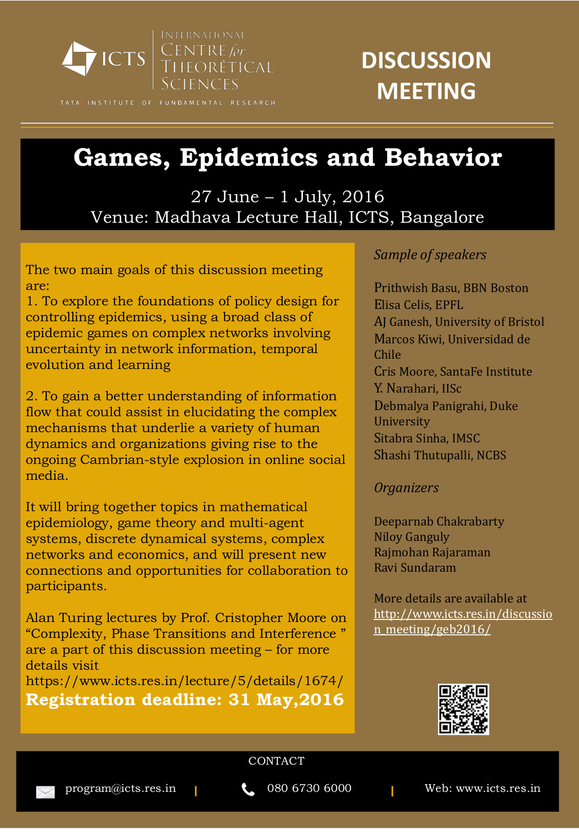 The two main goals of this Discussion Meeting are: 1. To explore the foundations of policy design for controlling epidemics, using a broad class of epidemic games on complex networks involving uncertainty in network information, temporal evolution and learning and 2. To gain a better understanding of information flow that could assist in elucidating the complex mechanisms that underlie a variety of human dynamics and organizations giving rise to the ongoing Cambrian-style explosion in online social media. It will bring together topics in mathematical epidemiology, game theory and multi-agent systems, discrete dynamical systems, complex networks and economics, and will present new connections and opportunities for collaboration to participants. Some of the specific technical issues we expect to be discussed include: