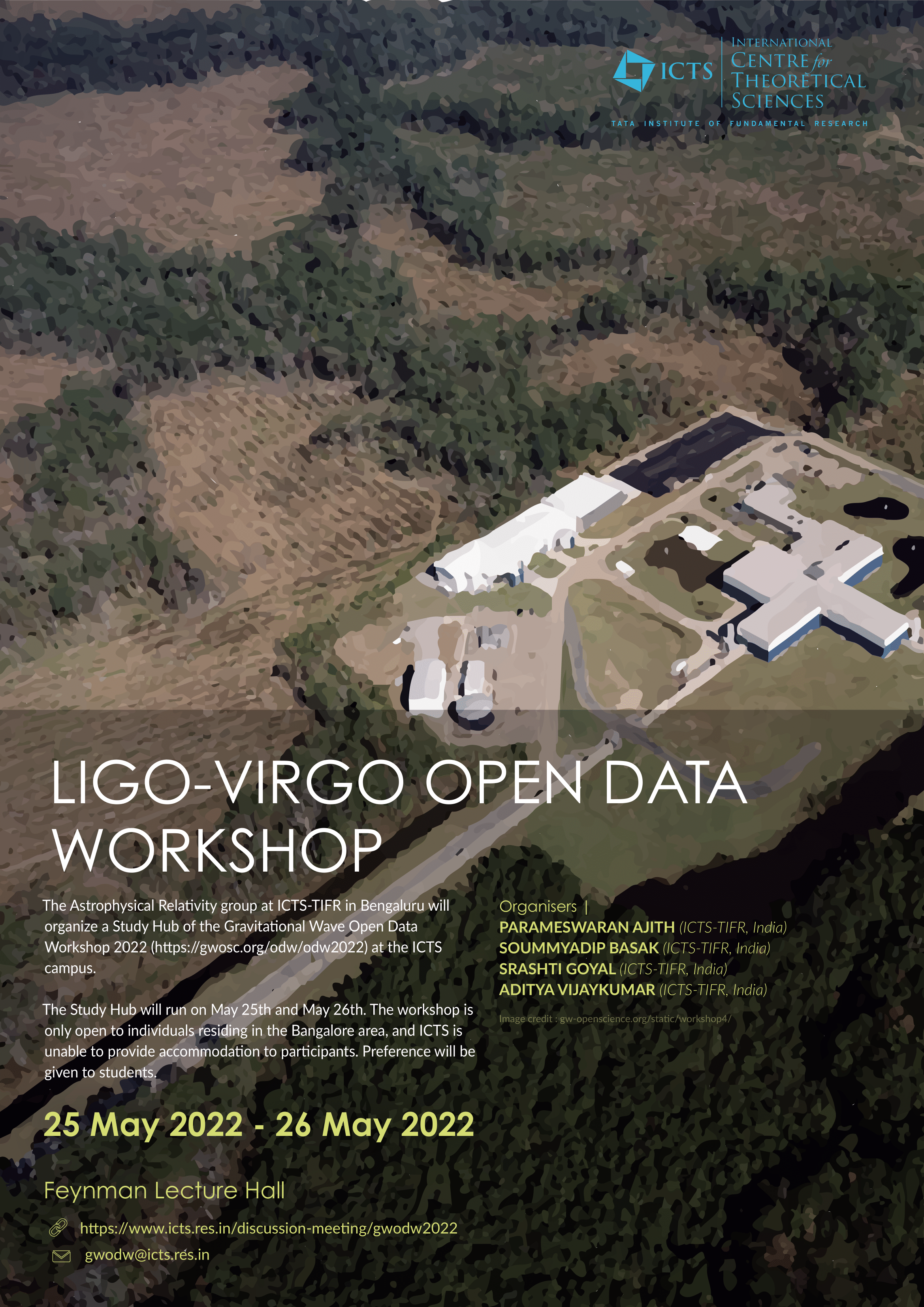 The Astrophysical Relativity group at ICTS-TIFR in Bengaluru will organize a Study Hub of the Gravitational Wave Open Data Workshop 2022 (https://gwosc.org/odw/odw2022) at the ICTS campus.