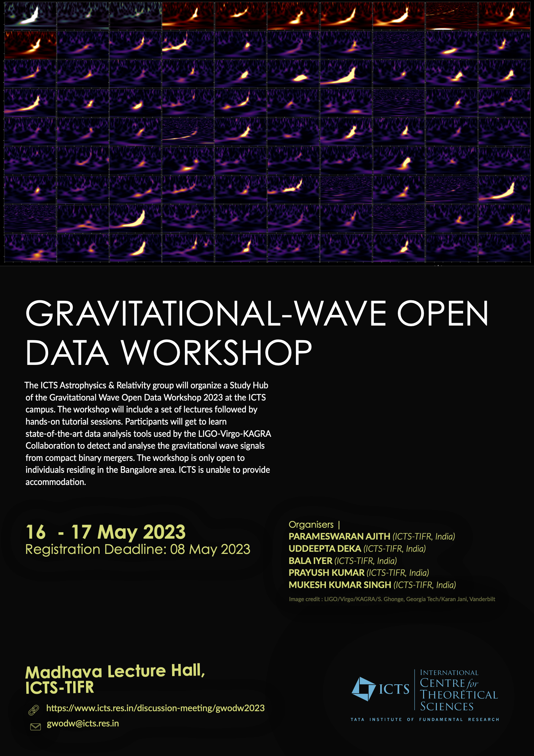 The ICTS Astrophysics & Relativity group will organize a Study Hub of the Gravitational Wave Open Data Workshop 2023 at the ICTS campus. The workshop will include a set of lectures followed by hands-on tutorial sessions. Participants will get to learn state-of-the-art data analysis tools used by the LIGO-Virgo-KAGRA Collaboration to detect and analyse the gravitational wave signals from compact binary mergers.