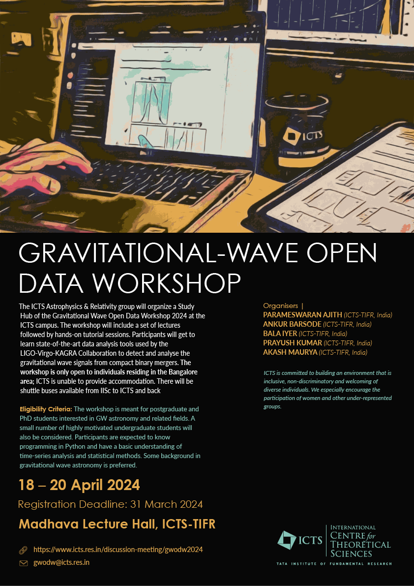 The ICTS Astrophysics & Relativity group will organize a Study Hub of the Gravitational Wave Open Data Workshop 2024 at the ICTS campus. The workshop will include a set of lectures followed by hands-on tutorial sessions. Participants will get to learn state-of-the-art data analysis tools used by the LIGO-Virgo-KAGRA Collaboration to detect and analyze the gravitational wave signals from compact binary mergers.