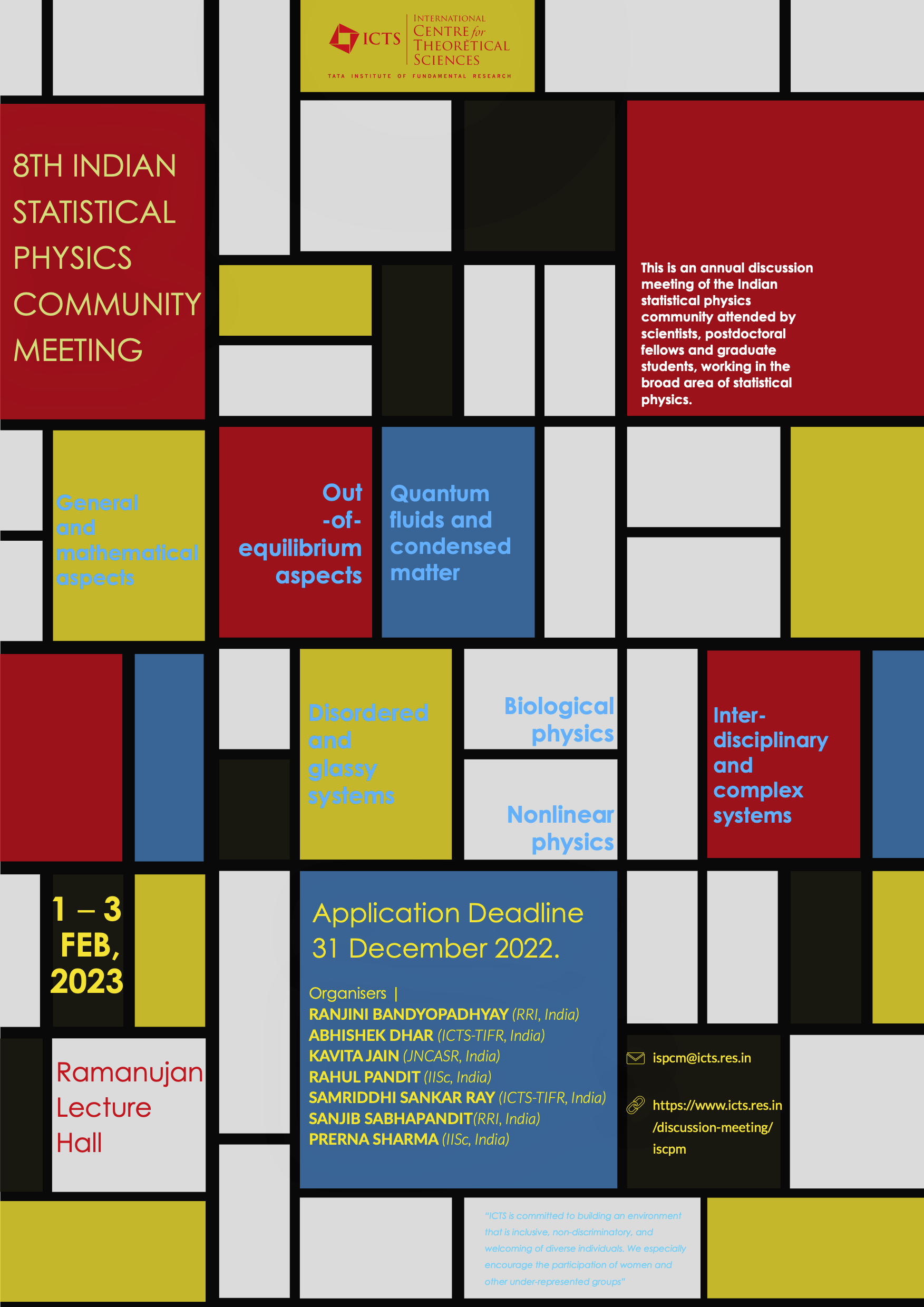 Eligibility criteria: Open to all graduate students, postdoctoral fellows and faculty members working in any of the different areas of statistical physics listed above.