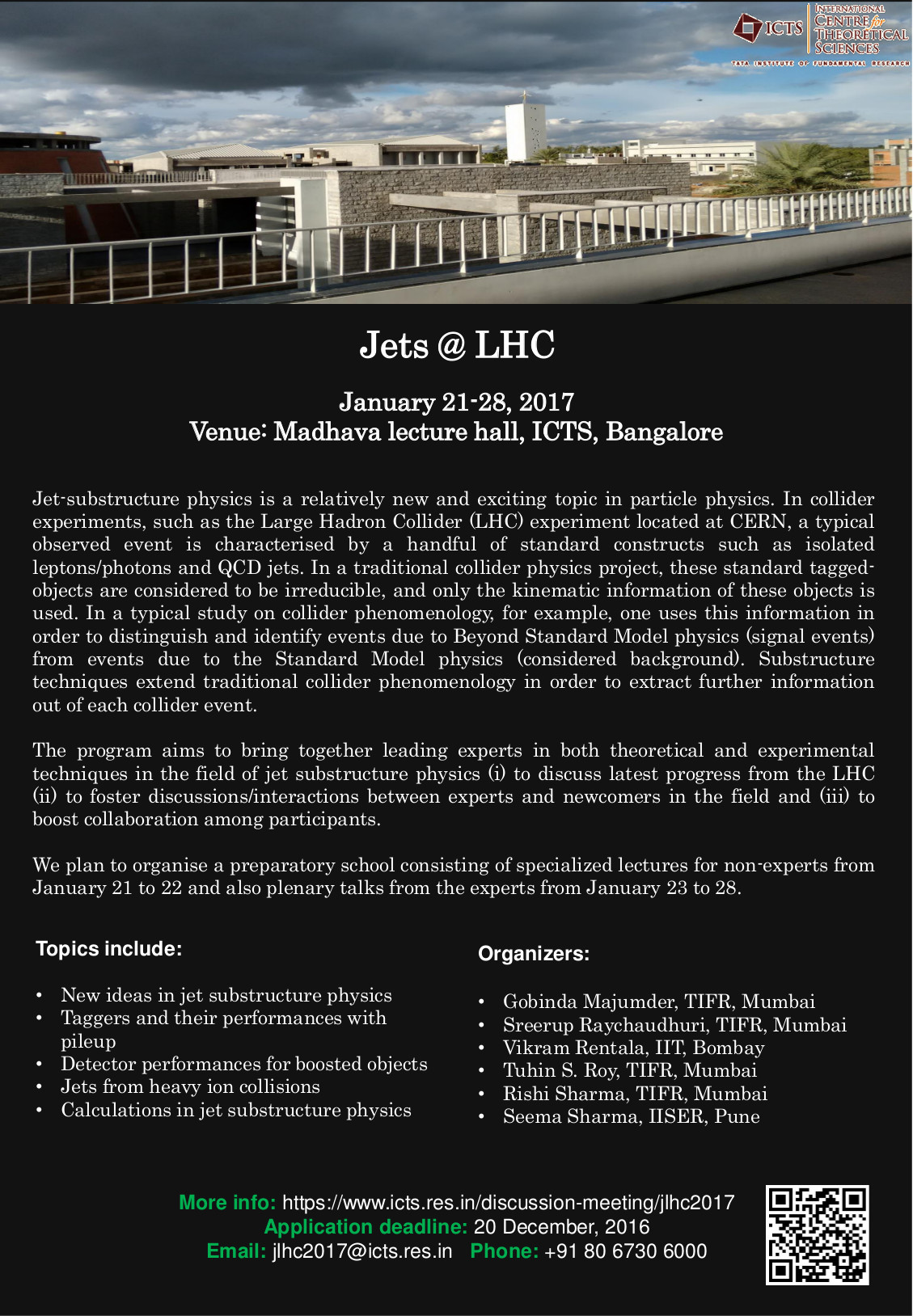 We seek applications from young scholars (postdocs and advanced graduate students). Priority will be given to the scholars who have already demonstrated some aspects of familiarity in the topic of jets at LHC (especially in jet-substructure). Faculty participation is by invitation only.