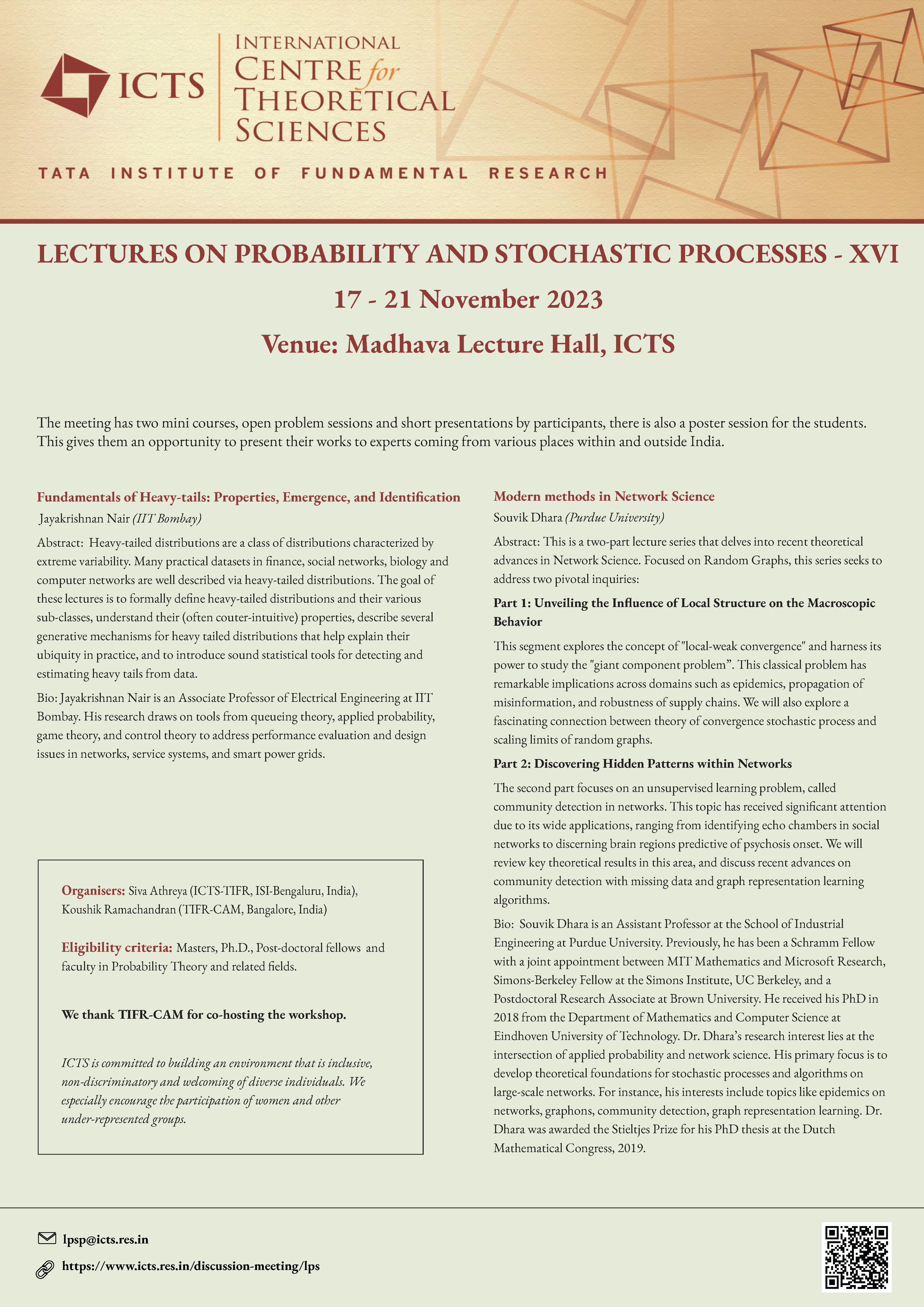 Towards this, Lectures on Probability and Stochastic Processes, an annual workshop was started in 2006. It is designed to have two mini-courses on topics of recent interest given by experts in the respective areas. These courses are expected to expose the participants to the important problems being considered in the current literature, as well as the available techniques to work with them. A large audience, which includes research scholars and young PhDs from different institutes and universities of India, as well as few foreign participants, are invited to the workshop. It is expected that this gathering will initiate collaborative work across different research centres of India. To facilitate this activity, the workshop has sufficient time for sessions, where researchers can pose and discuss problems that can be of interest to others in the audience.