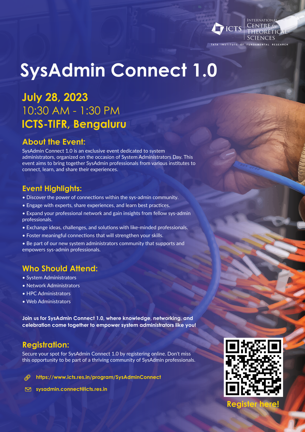 Secure your spot for SysAdmin Connect 1.0 by registering online. Don't miss this opportunity to be part of a thriving community of SysAdmin professionals. Register now at https://register1.icts.res.in/sysadmin-connect.