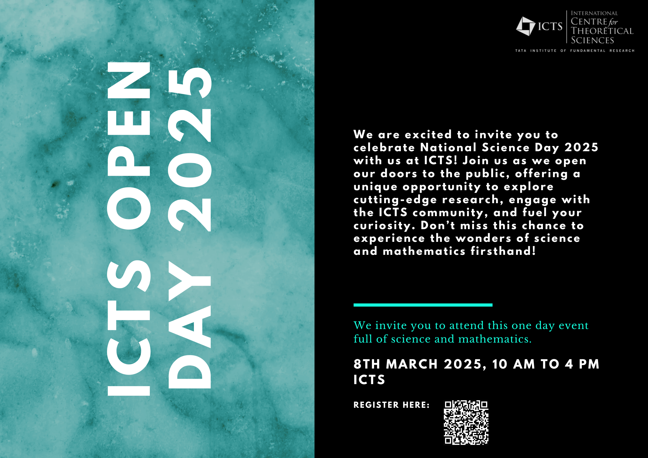 ICTS is opening its doors to the public for an exciting Science Festival! Join us on campus to explore groundbreaking research, interact with our brilliant minds, and experience science like never before. Students and faculties from ICTS will showcase their fascinating research works before you. Each research group from ICTS will explain their area of research to you.