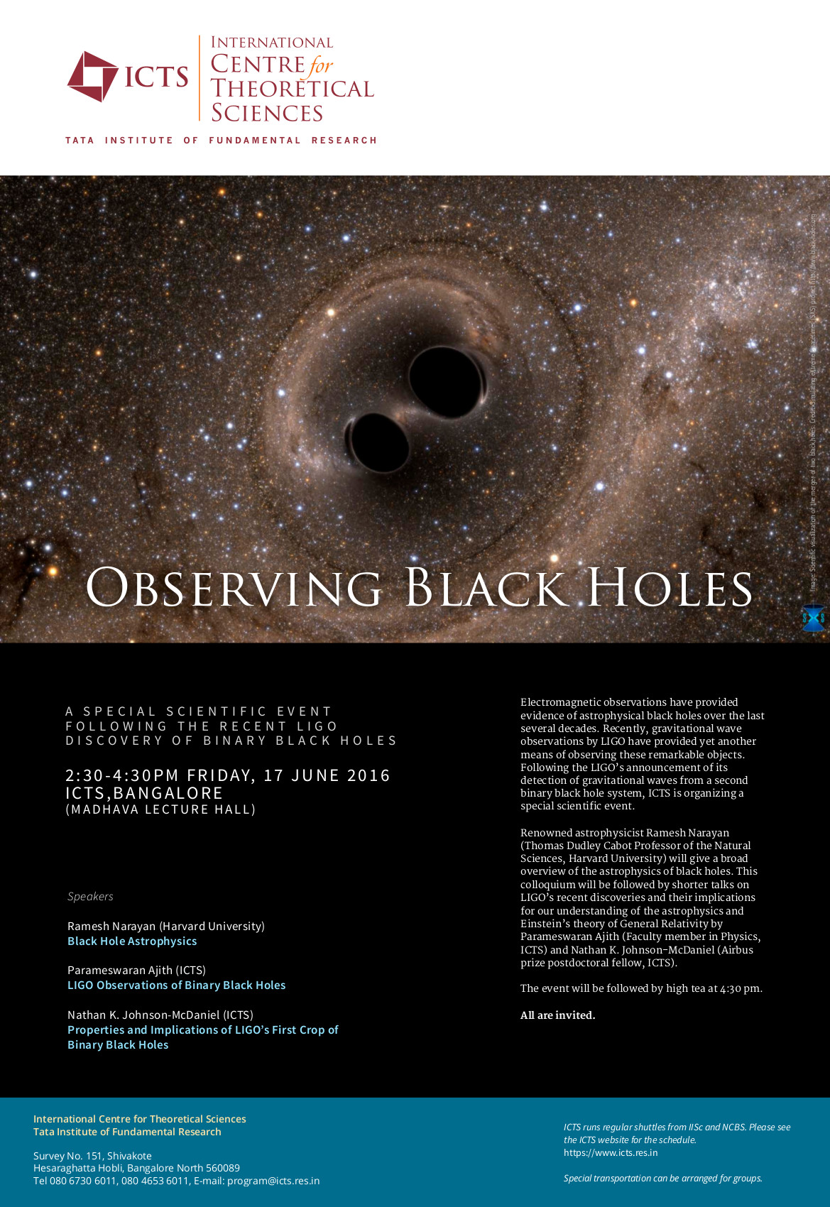 Renowned astrophysicist Ramesh Narayan (Thomas Dudley Cabot Professor of the Natural Sciences, Harvard University) will give a broad overview of the astrophysics of black holes. This colloquium will be followed by shorter talks on LIGO’s recent discoveries and their implications for our understanding of the astrophysics and Einstein’s theory of General Relativity by Parameswaran Ajith (Faculty member in Physics, ICTS) and Nathan K. Johnson-McDaniel (Airbus prize postdoctoral fellow, ICTS).