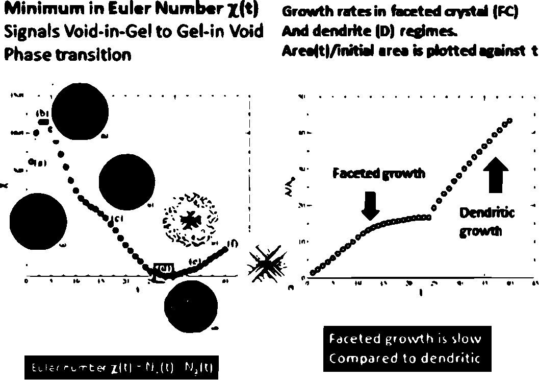 We report a study on the kinetics of drying of a droplet of aqueous gelatin containing sodium chloride. The process of drying recorded as a video clearly shows different regimes of growth leading to a variety of crystalline patterns. Large faceted crystals of mm size form in the early stages of evaporation Fig. 1(a), followed by highly branched multi- fractal patterns with micron sized features Fig. 1(b). We simulate the growth using a simple algorithm incorporating aggre-gation and evaporation, which reproduces the cross- over between the two growth regimes Fig. 1(c - d). As evaporation proceeds, voids form in the gel film. The time development of the fluidvoid system can be characterized by the Euler number. A minimum in the Euler number marks the transition between the two regimes of growth Fig. 2 .