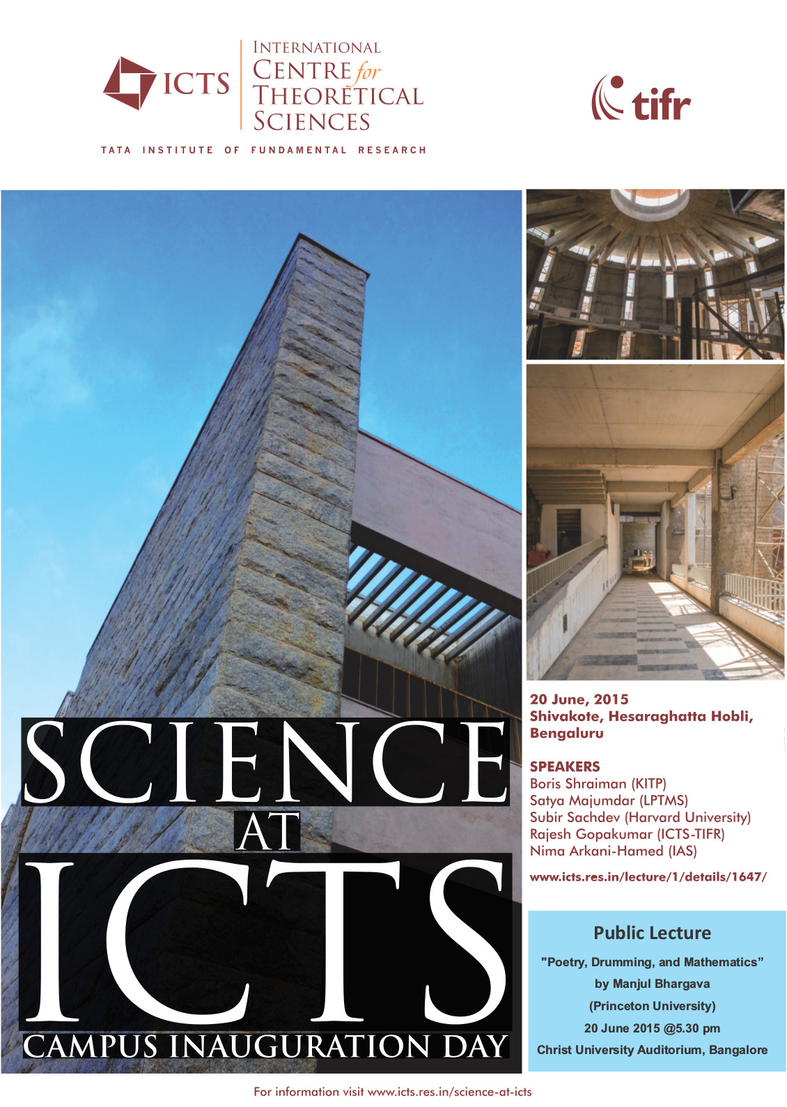 This event marks the inauguration of the Campus of the International Centre for Theoretical Sciences of TIFR. The academic program will consist of lectures in traditional areas of the basic sciences. There is a public lecture by Prof. Manjul Bhargava.