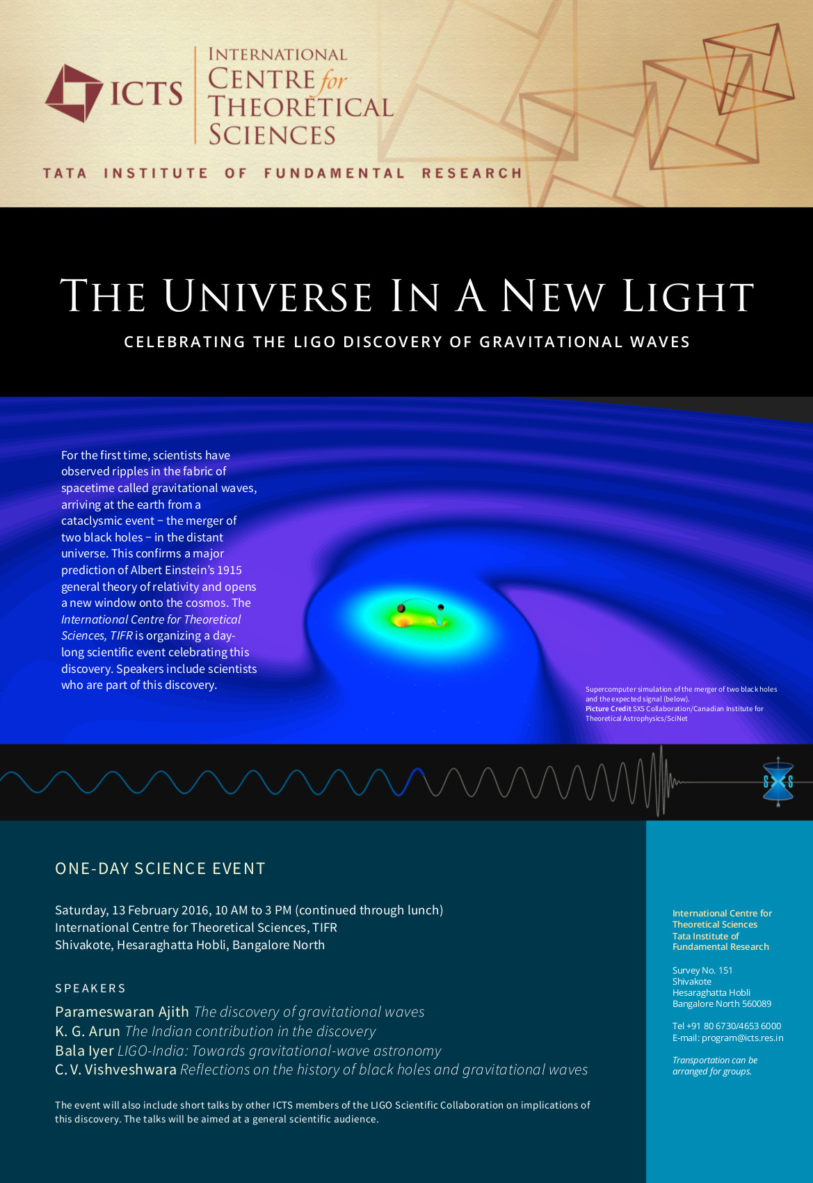 The discovery of gravitational waves is a special moment for science. In celebration of this occasion and also to highlight the important contributions made by the Indian scientific community, ICTS-TIFR is organising a day event (10am-3pm) on Saturday, 13 Feb 2016 at its new campus in Hesaraghatta. This event titled "The Universe in a New Light" will consist of talks aimed at a general scientific audience, which will explain the origin of gravitational waves, how they were detected and what we are learning from their detection as well as the new directions that now open up. The speakers include Bala Iyer (Simons Visiting Professor at ICTS-TIFR and Chairperson, IndIGO consortium), C. V. Vishveshwara, P. Ajith (group leader in Astrophysical relativity, ICTS-TIFR), K.G. Arun (CMI), Tarun Souradeep (IUCAA, Pune; Spokesperson, Indigo consortium). They will convey how this discovery opens a completely new window into the universe entirely different from how we have seen the universe hitherto - which has been only through electromagnetic waves (visible light, radio, X-ray etc.). There will also be an interaction with the press and an opportunity for them to talk with the various members of the scientific community present.
