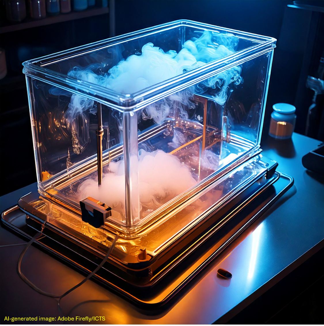 Building a cloud chamber at home can be a simple DIY project. At ICTS, we have built multiple versions of the cloud chamber of which one of the best working configurations was built using an open rectangular acrylic box (L x W x H = 15 x 10 x 8 cm), a thin (~ 3mm thick) Aluminium plate to close and air-tight the open side of the acrylic tank, 5 kgs of dry ice, isopropanol (IPA, 99.9 %), felt or sponges, double-sided tapes, glue, black paper sheets, torch or mobile flashlight, and a heating bag. By placing the metal plate over the dry ice and sealing the container with molding dough or cellotapes on the plate, we created a cold environment. Soaking the felt with isopropanol and placing it inside the lid above the cooled plate before sealing it had allowed the vapor to supersaturate the air inside the acrylic box. After 10-15 mins, when the Al plate is cooled down, tiny droplets of IPA (alcohol mists) were visible to fall down on the plate.