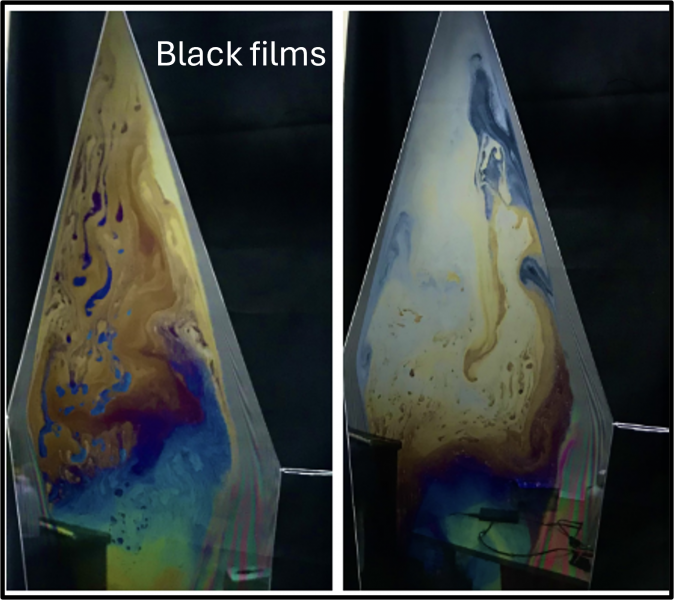 The colors of soap films come from thin-film interference, which occurs when the thickness of the film is comparable to the wavelength of light (in the range of visible light: 400 nm to 700 nm). As the film gets thinner, the colors change because the path difference between the light reflected from the top and bottom surfaces also changes. Eventually, when the film becomes extremely thin (around 50 Å), it appears black because the destructive interference completely cancels out the reflected light and known as Newton's black films (see images below).