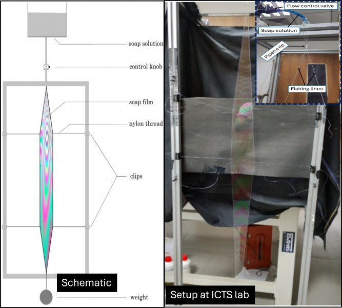 To observe the soap film, we used a setup where thin two nylon threads (fishing lines) were stretched between two points after coming out from a hole of a pipette tip through which the soap solution is flowing from a soap solution reservoir placed at a certain height. The soap film forms between the threads. We then allowed the soap solution to flow under gravity by controlling the flow with a knob, which allowed us to stabilize the film and study both the interference patterns and the fluid flow phenomena.