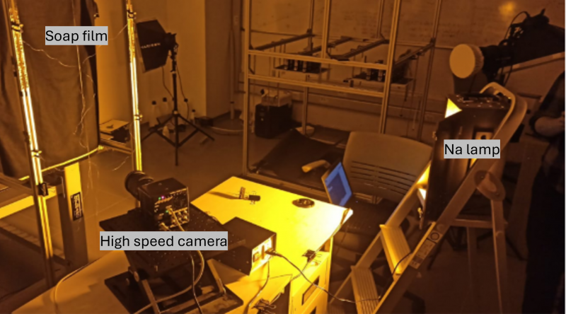 Beyond the colorful interference patterns, soap films also provide a unique way to study fluid flow in two dimensions. One of the most intriguing phenomena we can observe in this setup is the Von Kármán vortex street, a repeating pattern of swirling vortices that form when fluid flows past an object. This happens at specific ranges of the Reynolds number (a dimensionless number that characterizes fluid flow). We have used a monochromatic Na light source, a high-speed camera (fps > 2000), and a semi-dark room to observe the VK streets.