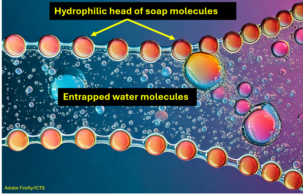 A soap film consists of a thin layer of water trapped between two layers of soap molecules (surfactants). The water is pulled by surface tension, and the soap molecules stabilize the film by reducing the surface tension, making it more elastic. This balance between surface tension and elasticity keeps the soap film intact and prevents it from breaking into droplets. The soap molecules are amphiphilic molecules with a hydrophilic head and a hydrophobic tail.