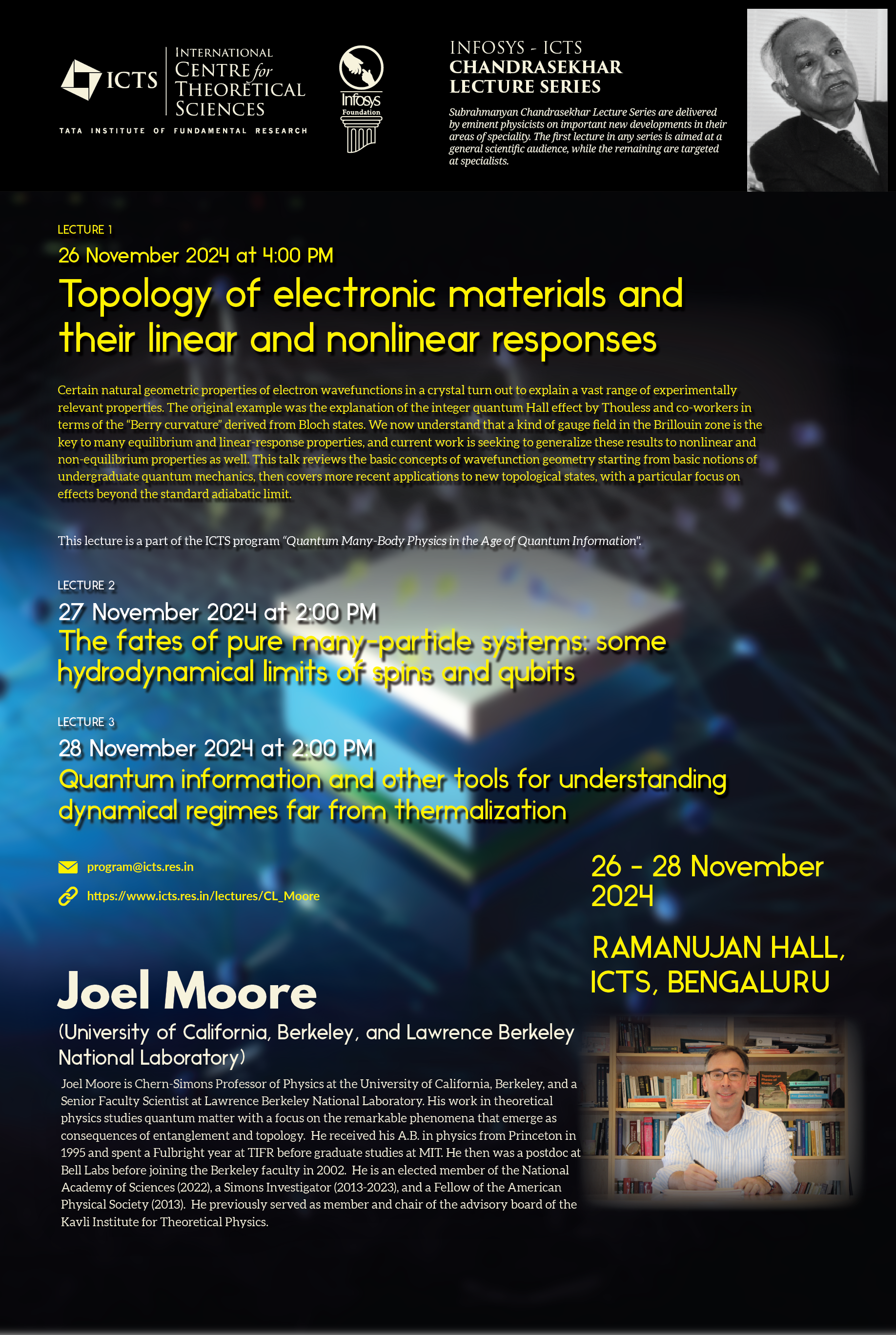 About the speaker: Joel Moore is Chern-Simons Professor of Physics at the University of California, Berkeley, and a Senior Faculty Scientist at Lawrence Berkeley National Laboratory. His work in theoretical physics studies quantum matter with a focus on the remarkable phenomena that emerge as consequences of entanglement and topology. He received his A.B. in physics from Princeton in 1995 and spent a Fulbright year at TIFR before graduate studies at MIT. He then was a postdoc at Bell Labs before joining the Berkeley faculty in 2002. He is an elected member of the National Academy of Sciences (2022), a Simons Investigator (2013-2023), and a Fellow of the American Physical Society (2013). He previously served as member and chair of the advisory board of the Kavli Institute for Theoretical Physics.