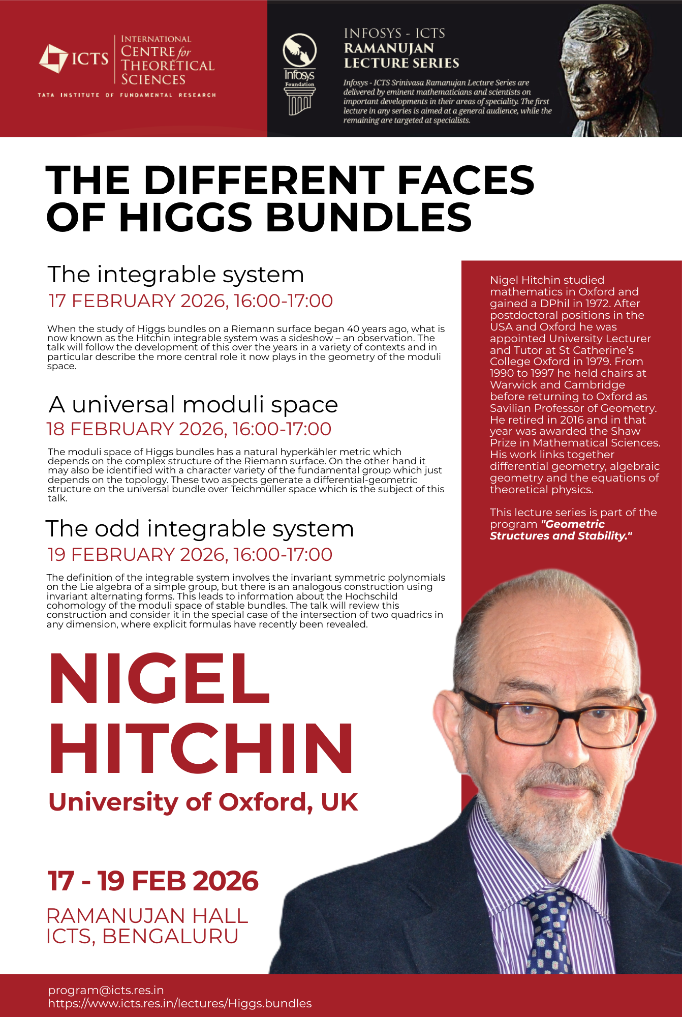About the speaker:  Nigel Hitchin studied mathematics in Oxford and gained a DPhil in 1972. After postdoctoral positions in the USA and Oxford he was appointed University Lecturer and Tutor at St Catherine’s College Oxford in 1979. From 1990 to 1997 he held chairs at Warwick and Cambridge before returning to Oxford as Savilian Professor of Geometry. He retired in 2016 and in that year was awarded the Shaw Prize in Mathematical Sciences. His work links together differential geometry, algebraic geometry and the equations of theoretical physics.