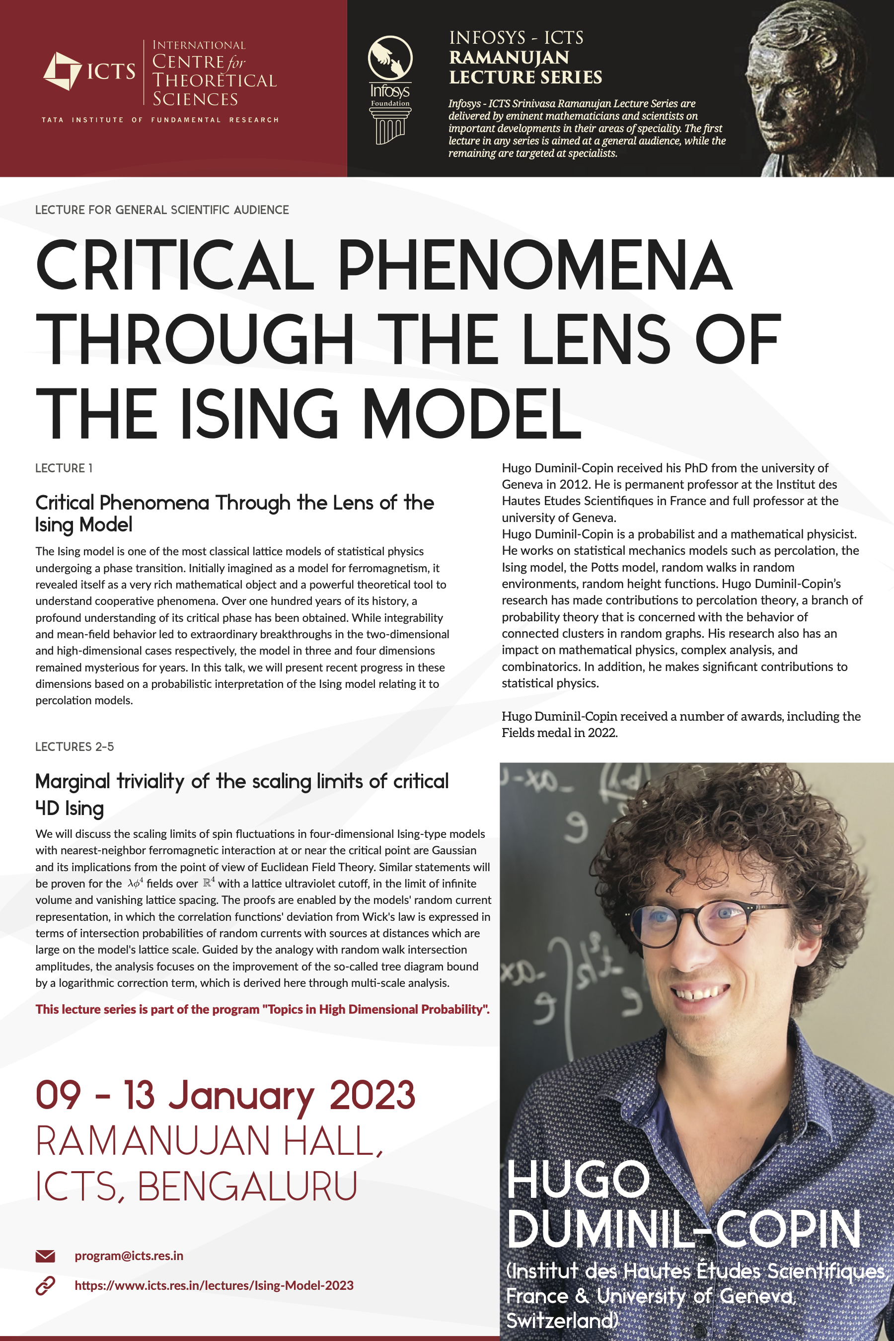 Hugo Duminil-Copin received his PhD from the university of Geneva in 2012. He is permanent professor at the Institut des Hautes Etudes Scientifiques in France and full professor at the university of Geneva.