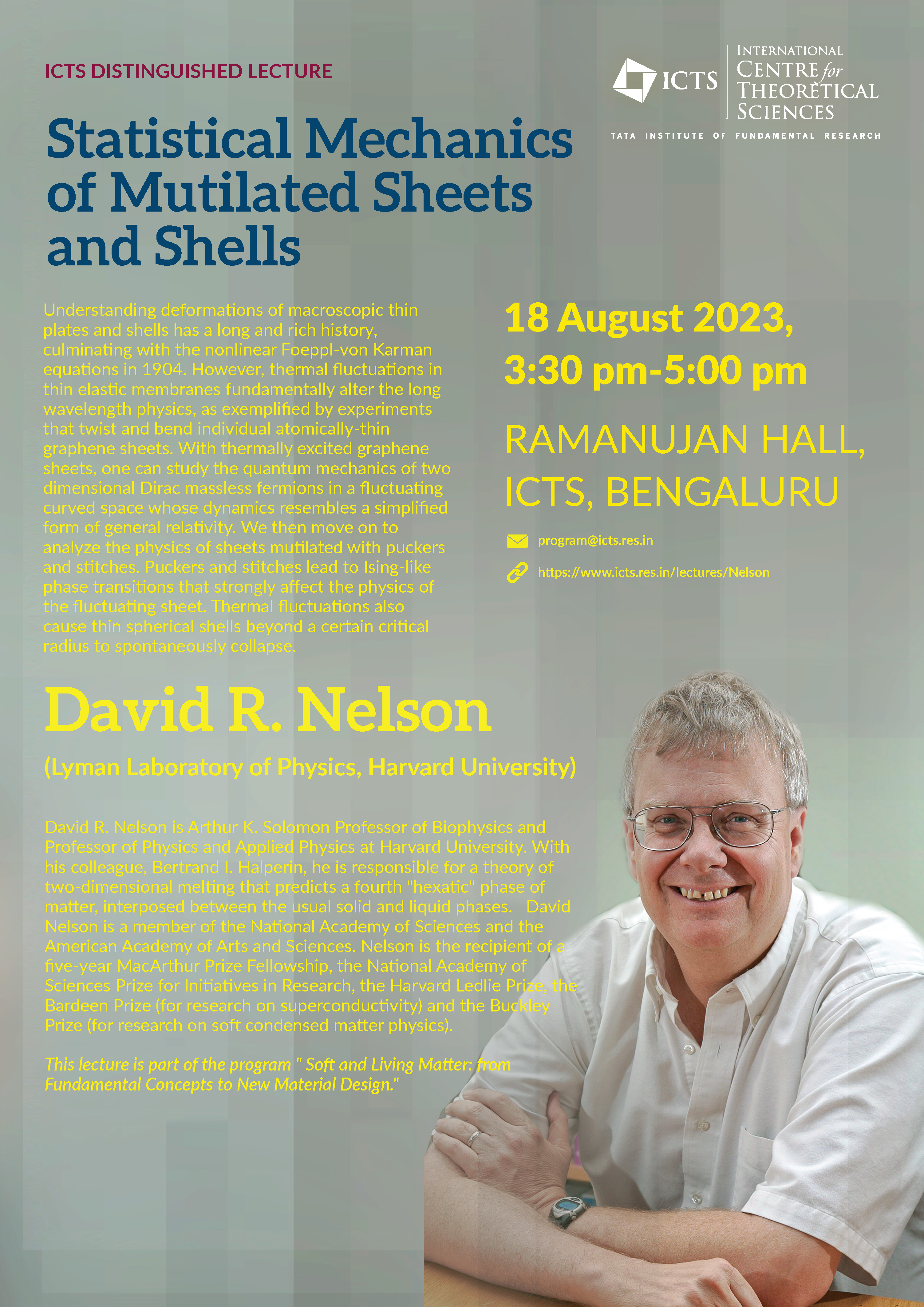 About the speaker: David R. Nelson is Arthur K. Solomon Professor of Biophysics and Professor of Physics and Applied Physics at Harvard University. He received his Ph.D. in 1975 from Cornell University. With his colleague, Bertrand I. Halperin, he is responsible for a theory of two-dimensional melting that predicts a fourth "hexatic" phase of matter, interposed between the usual solid and liquid phases. Nelson's research also includes a theory of the structure and statistical mechanics of metallic glasses and investigations of "tethered surfaces”, which are two-dimensional generalizations of linear polymer chains. In addition, Nelson has studied flux line entanglement and pinning in high temperature superconductors, where at high magnetic fields, thermal fluctuations cause regular arrays of vortex lines to melt into a tangled spaghetti state. Much of Nelson's recent research has focused on problems that bridge the gap between the physical and biological sciences, including genetic demixing in microorganisms, single molecule biophysics and the structure of viruses.