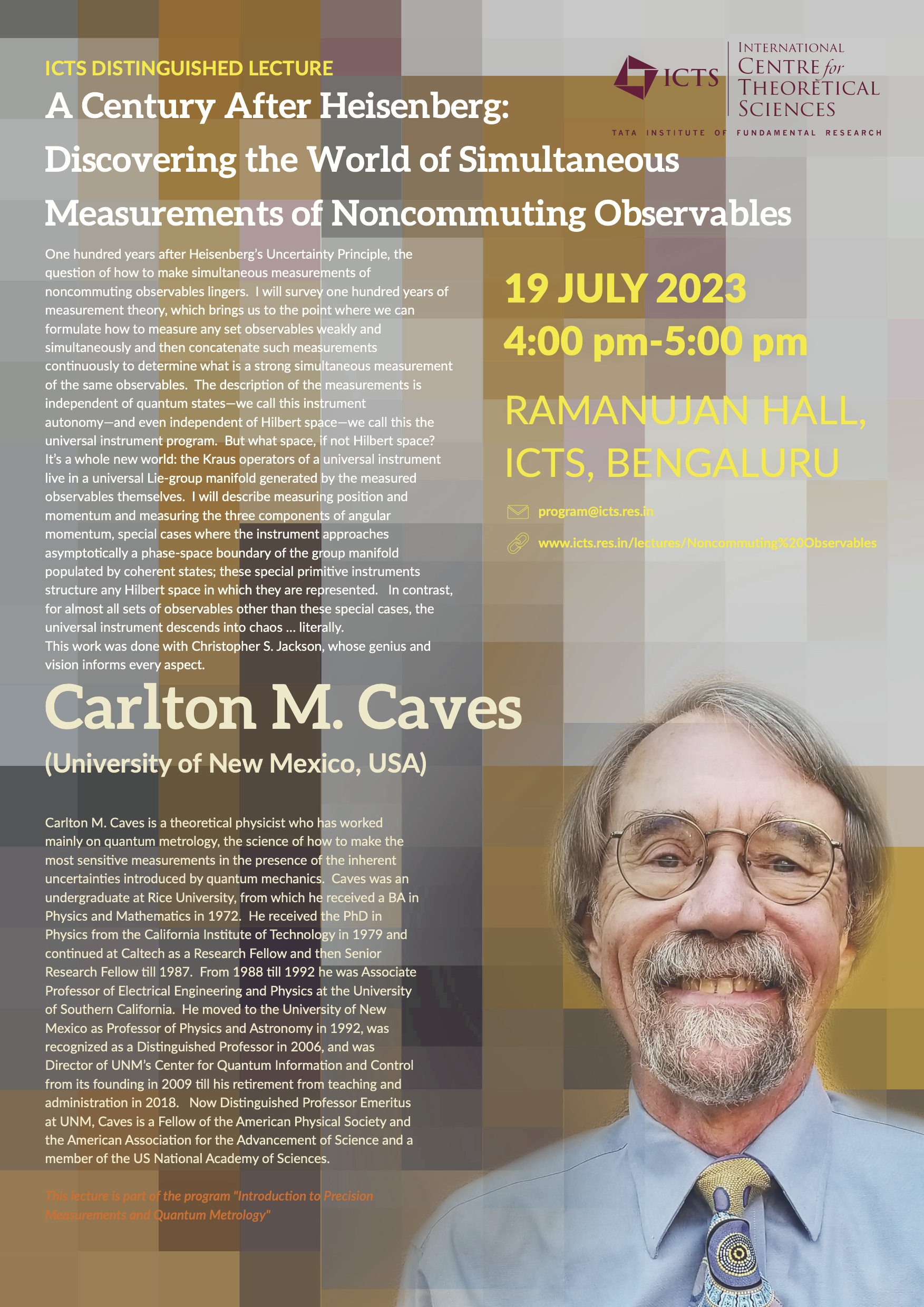 About the speaker: Carlton M. Caves is a theoretical physicist who has worked mainly on quantum metrology, the science of how to make the most sensitive measurements in the presence of the inherent uncertainties introduced by quantum mechanics. Caves was an undergraduate at Rice University, from which he received a BA in Physics and Mathematics in 1972. He received the PhD in Physics from the California Institute of Technology in 1979 and continued at Caltech as a Research Fellow and then Senior Research Fellow till 1987. From 1988 till 1992 he was Associate Professor of Electrical Engineering and Physics at the University of Southern California. He moved to the University of New Mexico as Professor of Physics and Astronomy in 1992, was recognized as a Distinguished Professor in 2006, and was Director of UNM’s Center for Quantum Information and Control from its founding in 2009 till his retirement from teaching and administration in 2018. Now Distinguished Professor Emeritus at UNM, Caves is a Fellow of the American Physical Society and the American Association for the Advancement of Science and a member of the US National Academy of Sciences.