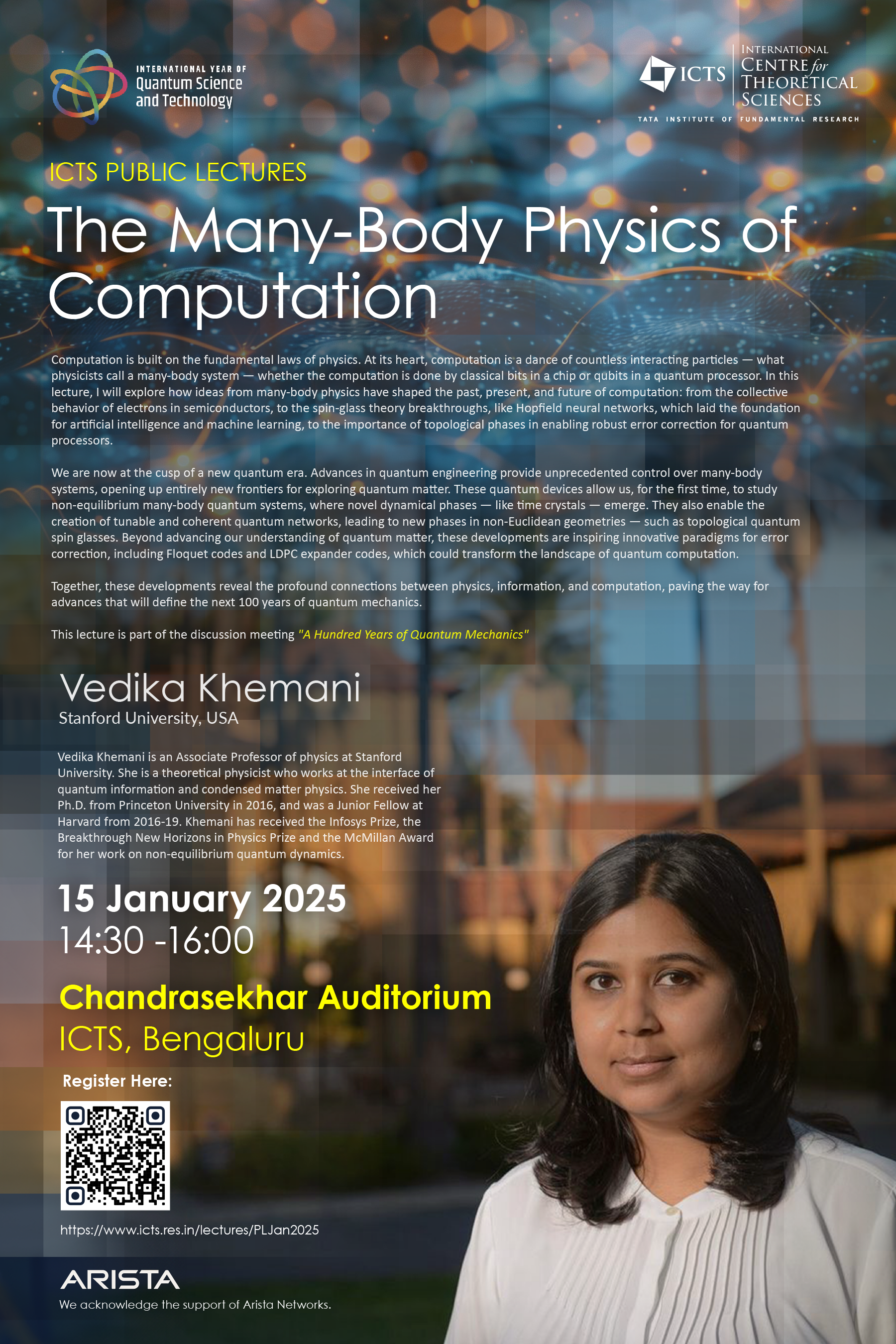 Abstract: Computation is built on the fundamental laws of physics. At its heart, computation is a dance of countless interacting particles — what physicists call a many-body system — whether the computation is done by classical bits in a chip or qubits in a quantum processor. In this lecture, I will explore how ideas from many-body physics have shaped the past, present, and future of computation: from the collective behavior of electrons in semiconductors, to the spin-glass theory breakthroughs, like Hopfield neural networks, which laid the foundation for artificial intelligence and machine learning, to the importance of topological phases in enabling robust error correction for quantum processors.
