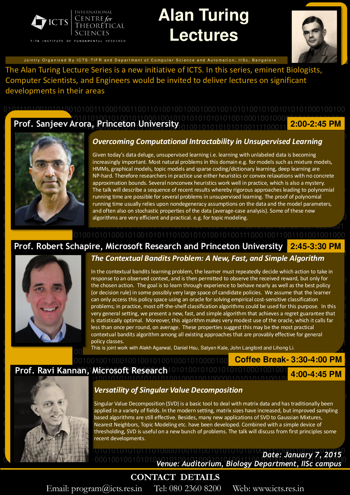 The Alan Turing lecture series is a new initiative of ICTS. In this series, eminent Biologists, Computer Scientists, and Engineers would be invited to deliver lectures on significant developments in their areas. Details about this inaugural Turing lecture series and the lecturers are given below.