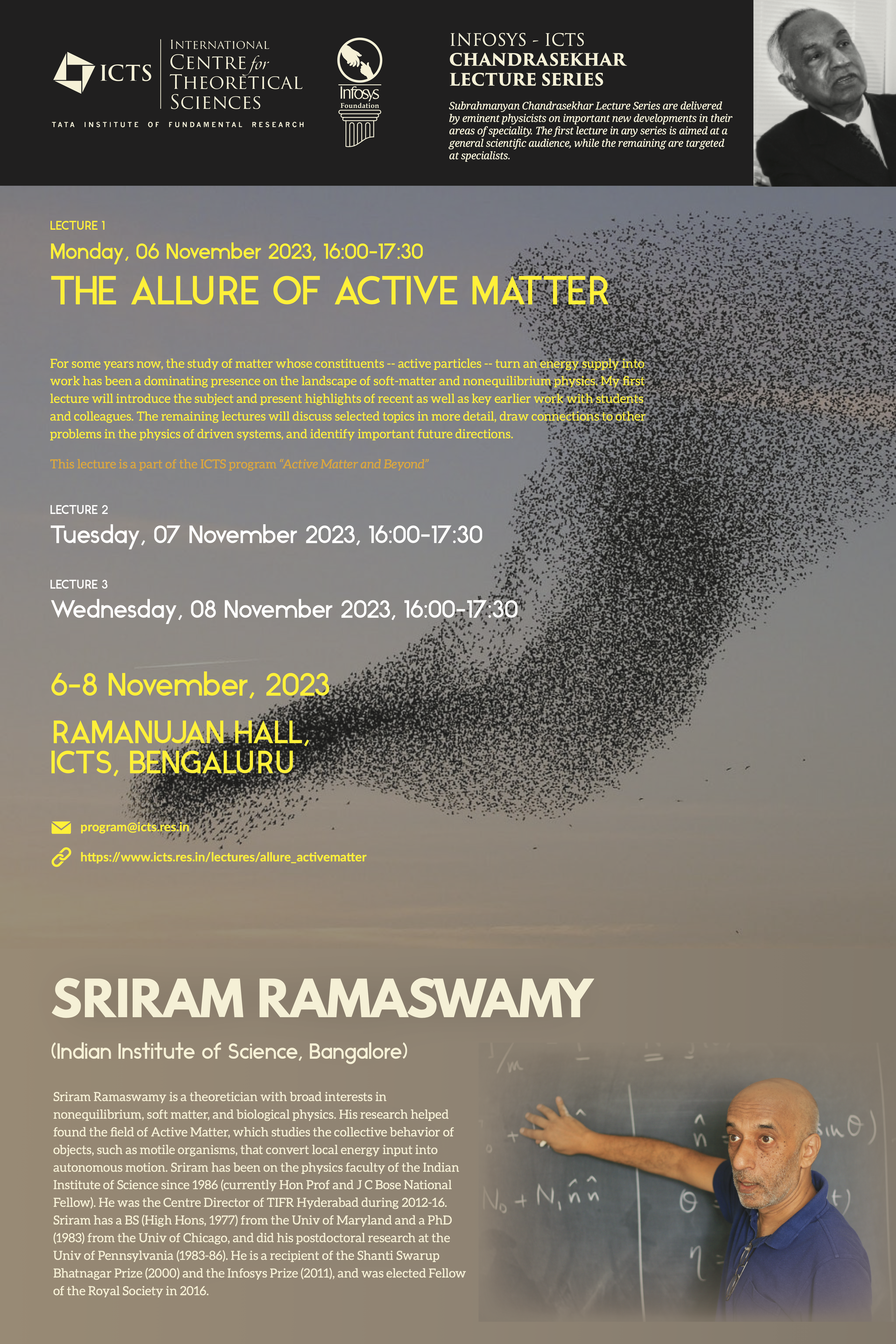 Sriram Ramaswamy is a theoretician with broad interests in nonequilibrium, soft matter, and biological physics. His research helped found the field of Active Matter, which studies the collective behavior of objects, such as motile organisms, that convert local energy input into autonomous motion. Sriram has been on the physics faculty of the Indian Institute of Science since 1986 (currently Hon Prof and J C Bose National Fellow). He was the Centre Director of TIFR Hyderabad during 2012-16. Sriram has a BS (High Hons, 1977) from the Univ of Maryland and a PhD (1983) from the Univ of Chicago, and did his postdoctoral research at the Univ of Pennsylvania (1983-86). He is a recipient of the Shanti Swarup Bhatnagar Prize (2000) and the Infosys Prize (2011), and was elected Fellow of the Royal Society in 2016.