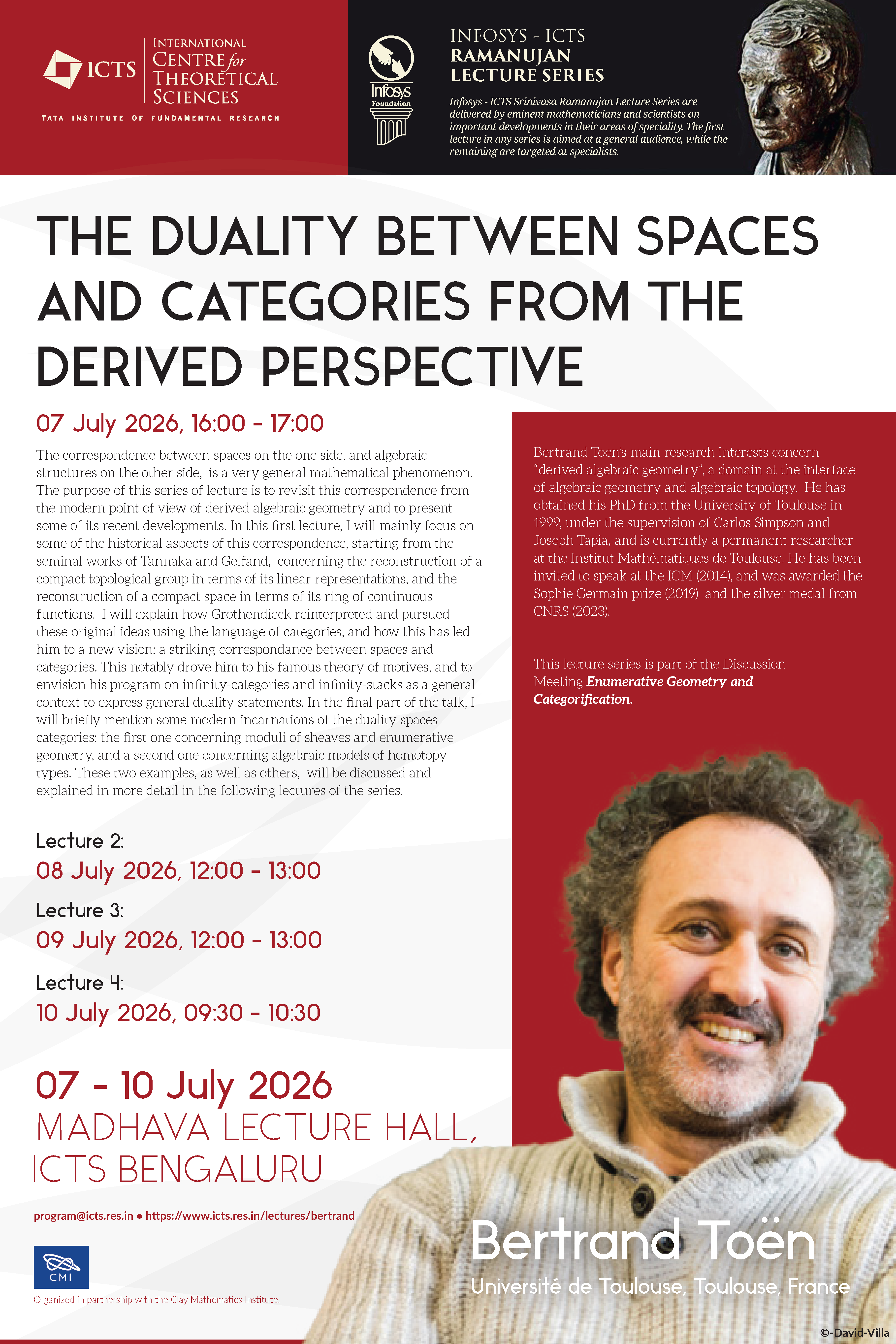 About the speaker: Bertrand Toen’s main research interests concern “derived algebraic geometry”, a domain at the interface of algebraic geometry and algebraic topology. He has obtained his PhD from the University of Toulouse in 1999, under the supervision of Carlos Simpson and Joseph Tapia, and is currently a permanent researcher at the Institut Mathématiques de Toulouse. He has been invited to speak at the ICM (2014), and was awarded the Sophie Germain prize (2019) and the silver medal from CNRS (2023).