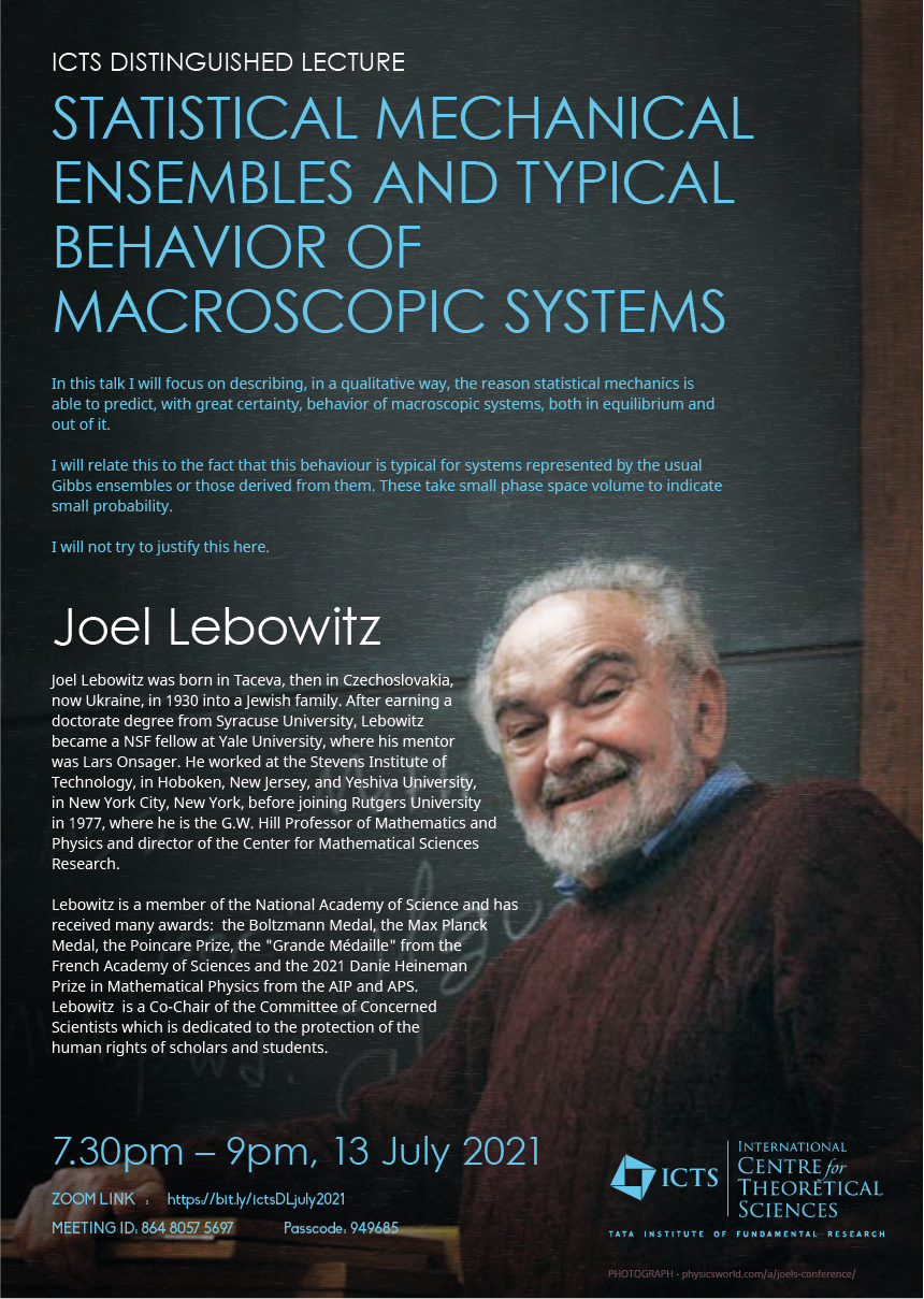About the Speaker: Joel Lebowitz was born in Taceva, then in Czechoslovakia, now Ukraine, in 1930 into a Jewish family. After earning a doctorate degree from Syracuse University, Lebowitz became a NSF fellow at Yale University, where his mentor was Lars Onsager. He worked at the Stevens Institute of Technology, in Hoboken, New Jersey, and Yeshiva University, in New York City, New York, before joining Rutgers University in 1977, where he is the G.W. Hill Professor of Mathematics and Physics and director of the Center for Mathematical Sciences Research.