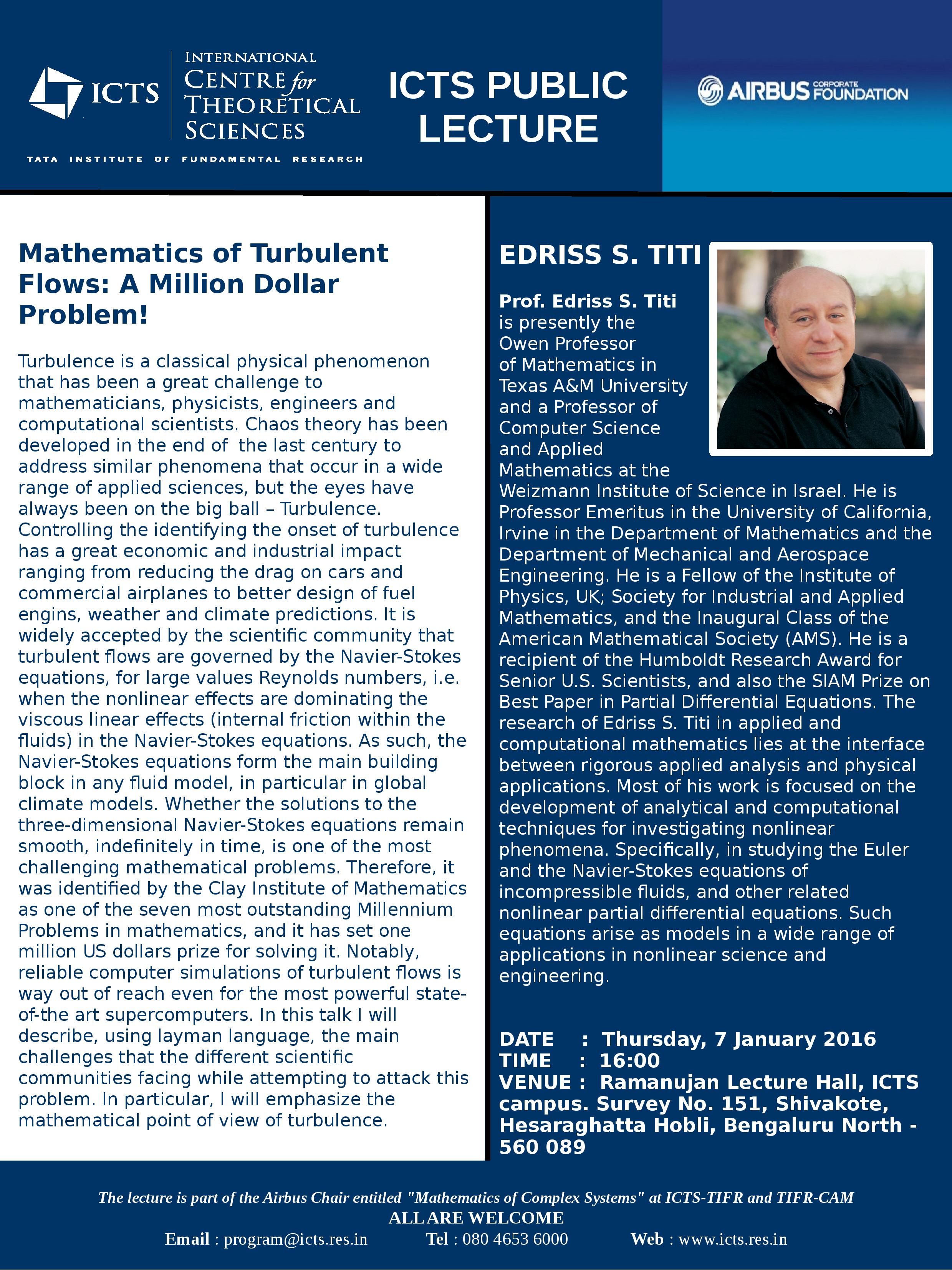 Turbulence is a classical physical phenomenon that has been a great challenge to mathematicians, physicists, engineers and computational scientists. Chaos theory has been developed in the end of the last century to address similar phenomena that occur in a wide range of applied sciences, but the eyes have always been on the big ball – Turbulence.Controlling the identifying the onset of turbulence has a great economic and industrial impact ranging from reducing the drag on cars and commercial airplanes to better design of fuel engins, weather and climate predictions. It is widely accepted by the scientific community that turbulent flows are governed by the Navier-Stokes equations, for large values Reynolds numbers, i.e. when the nonlinear effects are dominating the viscous linear effects (internal friction within the fluids) in the Navier-Stokes equations. As such, the Navier-Stokes equations form the main building block in any fluid model, in particular in global climate models. Whether the solutions to the three-dimensional Navier-Stokes equations remain smooth, indefinitely in time, is one of the most challenging mathematical problems. Therefore, it was identified by the Clay Institute of Mathematics as one of the seven most outstanding Millennium Problems in mathematics, and it has set one million US dollars prize for solving it. Notably, reliable computer simulations of turbulent flows is way out of reach even for the most powerful state-of-the art supercomputers. In this talk I will describe, using layman language, the main challenges that the different scientific communities facing while attempting to attack this problem. In particular, I will emphasize the mathematical point of view of turbulence.