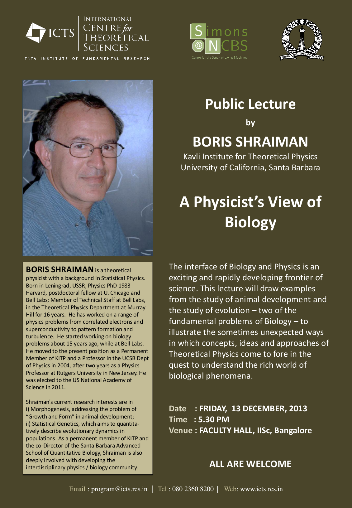 The interface of Biology and Physics is an exciting and rapidly developing frontier of science. This lecture will draw examples from the study of animal development and the study of evolution – two of the fundamental problems of Biology – to illustrate the sometimes unexpected ways in which concepts, ideas and approaches of Theoretical Physics come to fore in the quest to understand the rich world of biological phenomena.