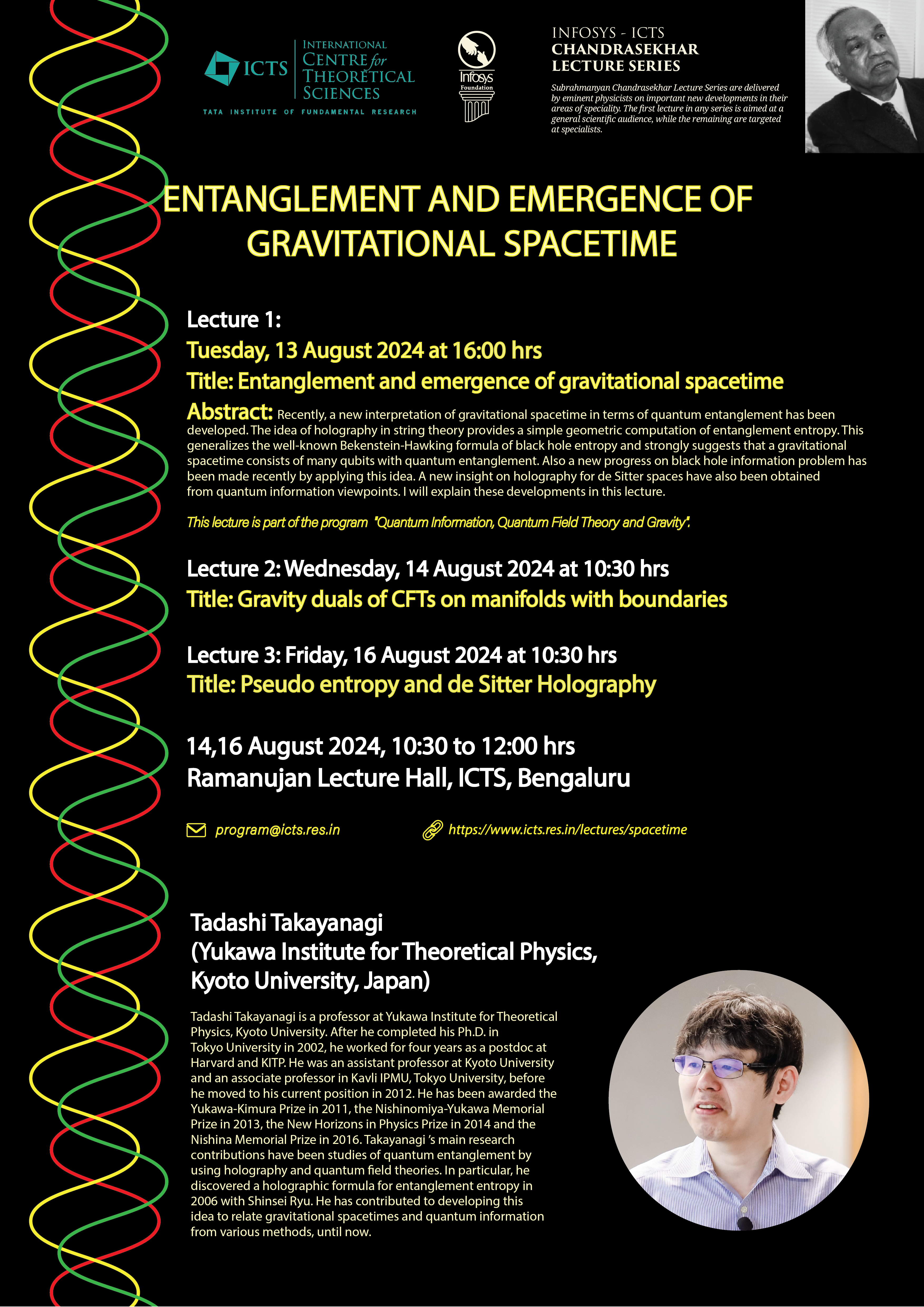 About the speaker: Tadashi Takayanagi is a professor at Yukawa Institute for Theoretical Physics, Kyoto University. After he completed his Ph.D. in Tokyo University in 2002, he worked for four years as a postdoc at Harvard and KITP. He was an assistant professor at Kyoto University and an associate professor in Kavli IPMU, Tokyo University, before he moved to his current position in 2012. He has been awarded the Yukawa-Kimura Prize in 2011, the Nishinomiya-Yukawa Memorial Prize in 2013, the New Horizons in Physics Prize in 2014 and the Nishina Memorial Prize in 2016. Takayanagi ’s main research contributions have been studies of quantum entanglement by using holography and quantum field theories. In particular, he discovered a holographic formula for entanglement entropy in 2006 with Shinsei Ryu. He has contributed to developing this idea to relate gravitational spacetimes and quantum information from various methods, until now.